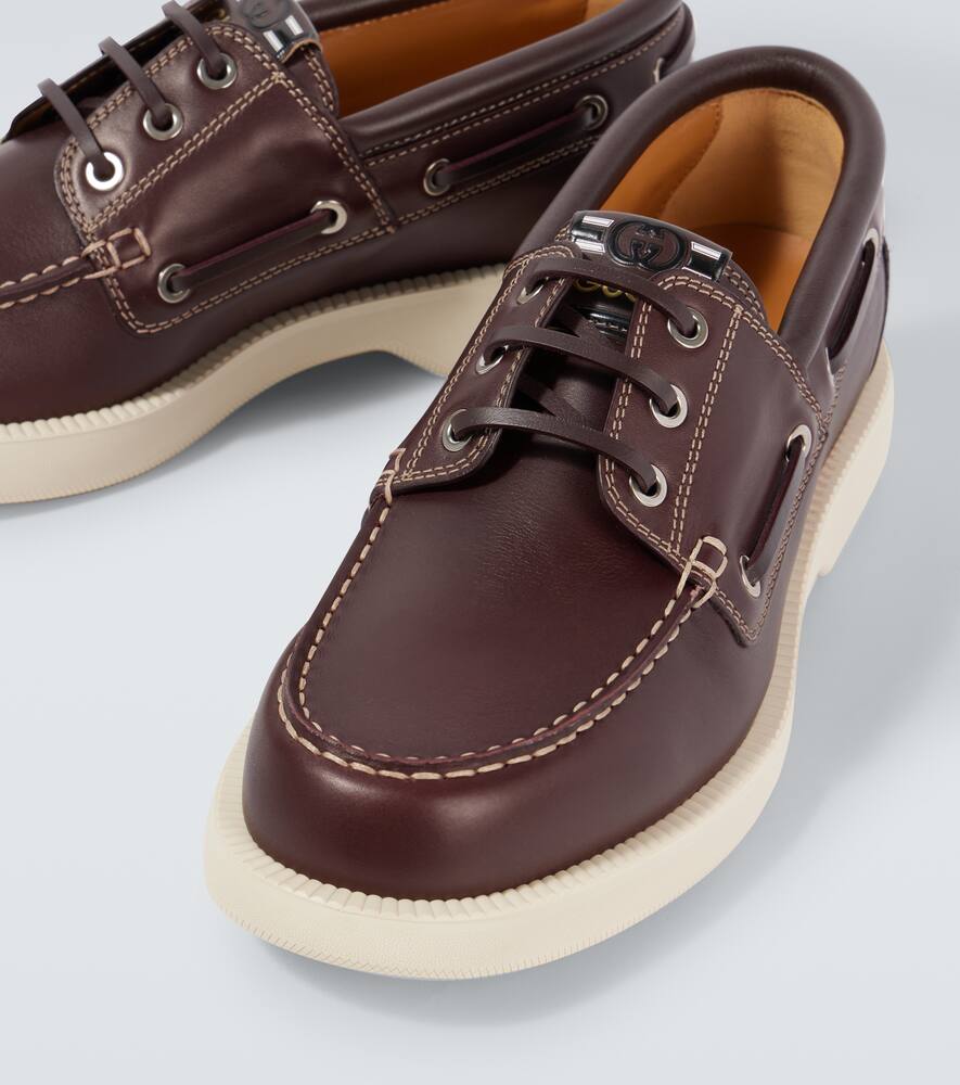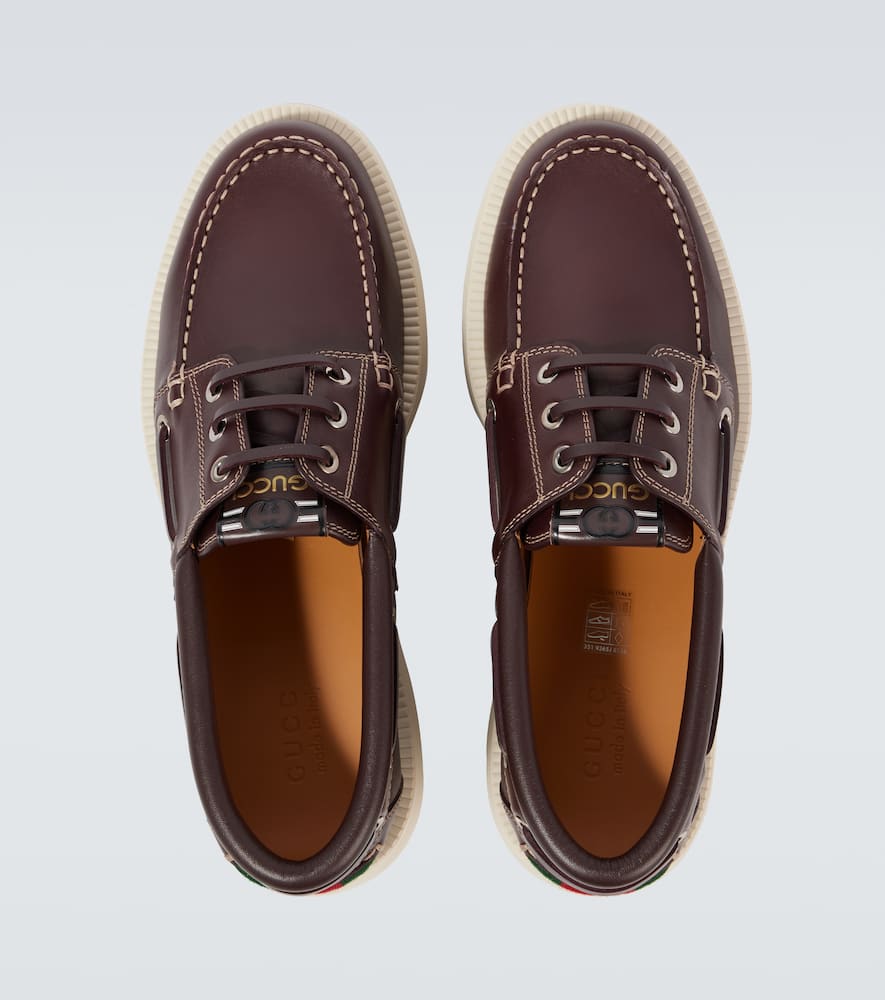 Upper: leather. Lining: leather. Sole: leather insole, rubber sole. Toe shape: almond toe. Made in Italy. Includes: shoe box, dust bags. Designer color name: DK BORD/DK.BO/VRV/IV. Closure: lace-up. Hardware color: silver. Shop Gucci Loafers for men and other designer shoes now.