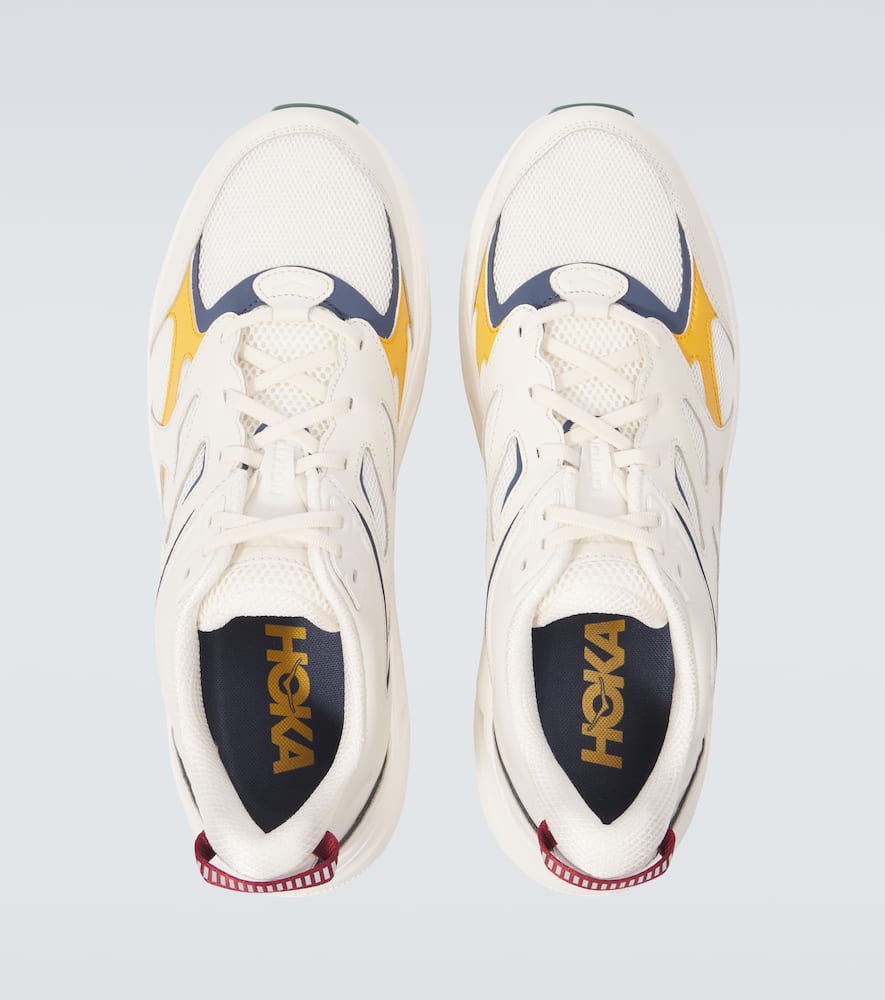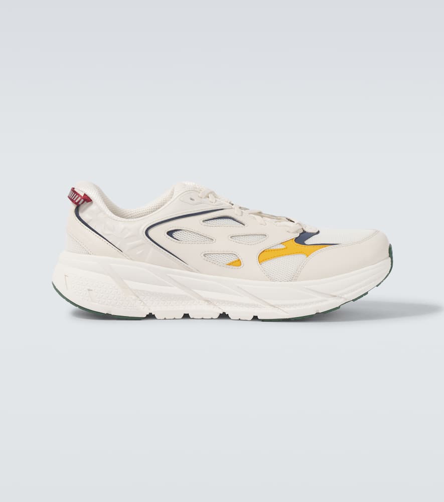 Upper: calf leather. Lining: fabric. Sole: fabric insole, rubber sole. Toe shape: almond toe. Made in Vietnam. Includes: shoe box. Designer color name: Oat Milk / Alabaster. Trim: fabric. Closure: lace-up. Shop Hoka One One Sports Sneakers for men and other designer shoes now.
