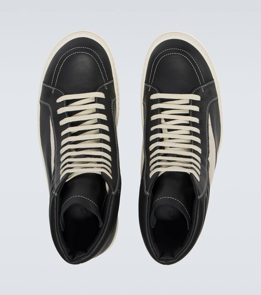 Upper: leather. Lining: leather. Sole: leather insole, rubber sole. Toe shape: round toe. Made in Italy. Includes: shoe box. Designer color name: Black/Milk/Milk. Closure: lace-up. Shop Rick Owens High-Top Sneakers for men and other designer shoes now.