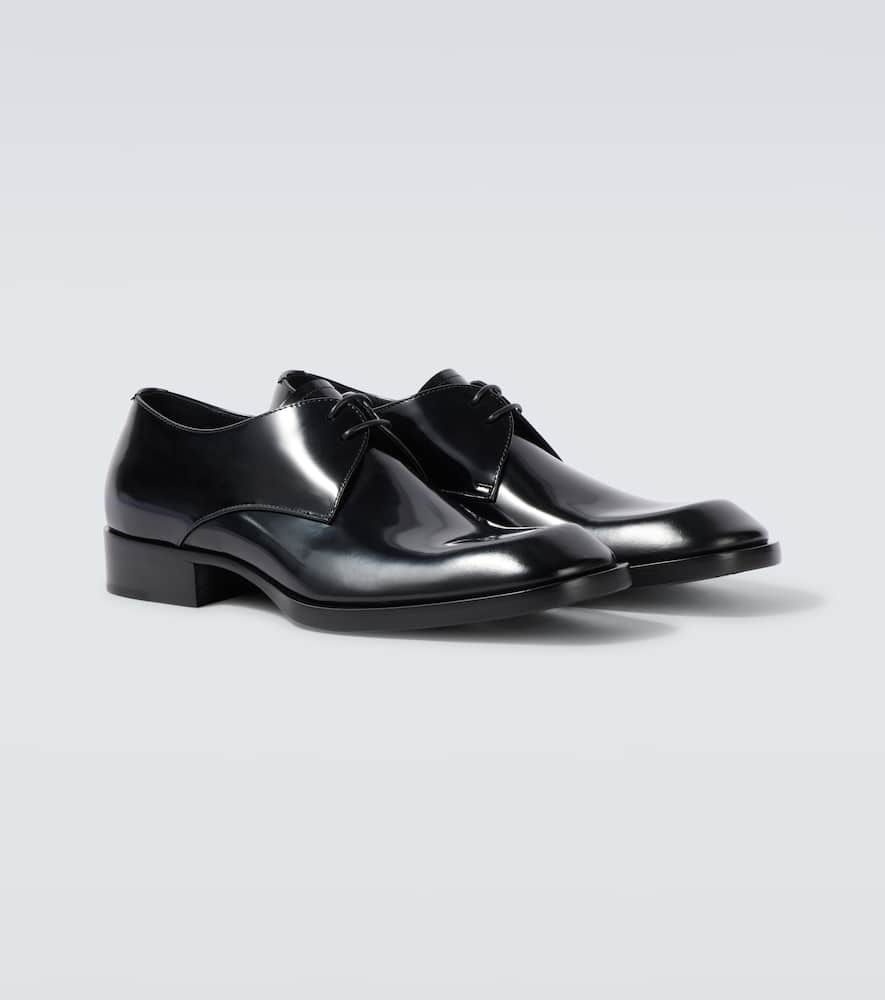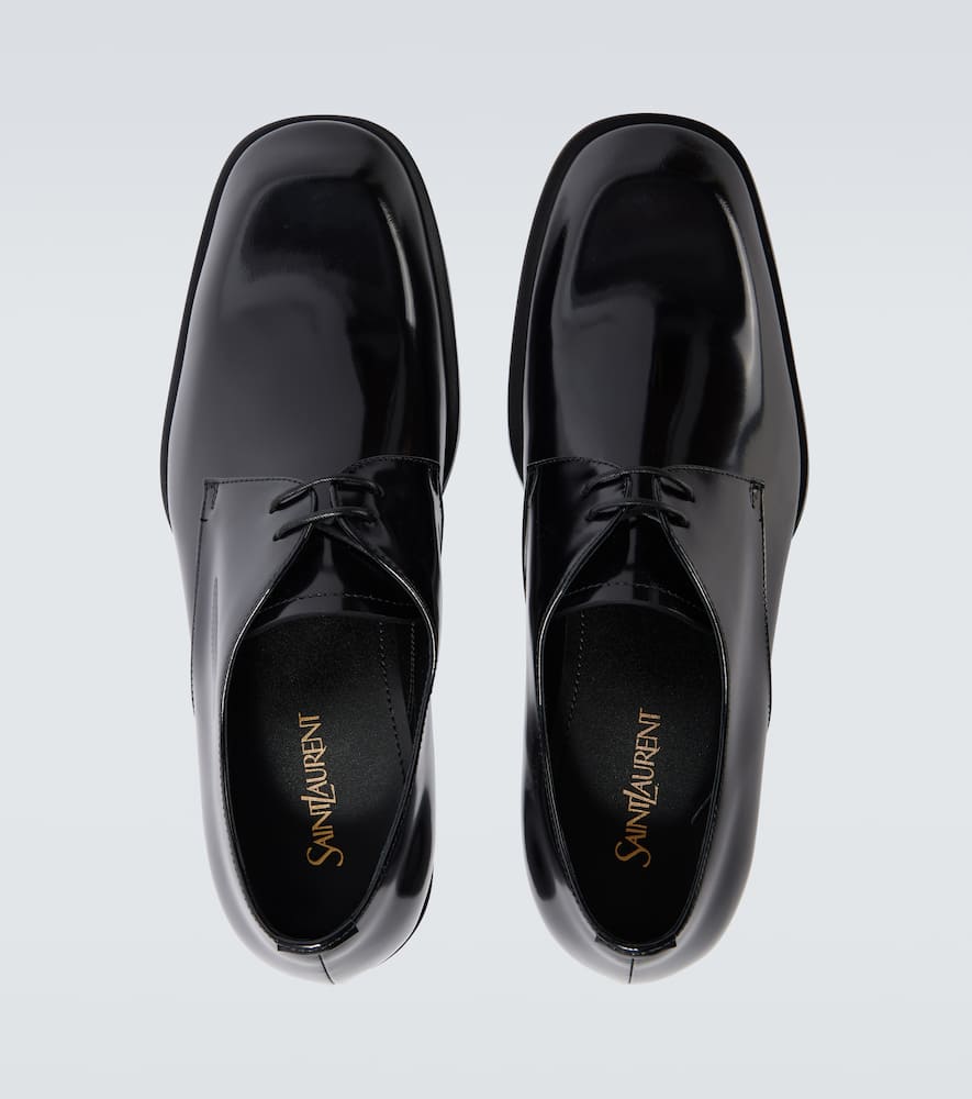 Upper: leather. Lining: leather. Sole: leather insole and sole. Toe shape: square toe. Made in Italy. Includes: shoe box, dust bags. Designer color name: Noir. Shop Saint Laurent Derby for men and other designer shoes now.
