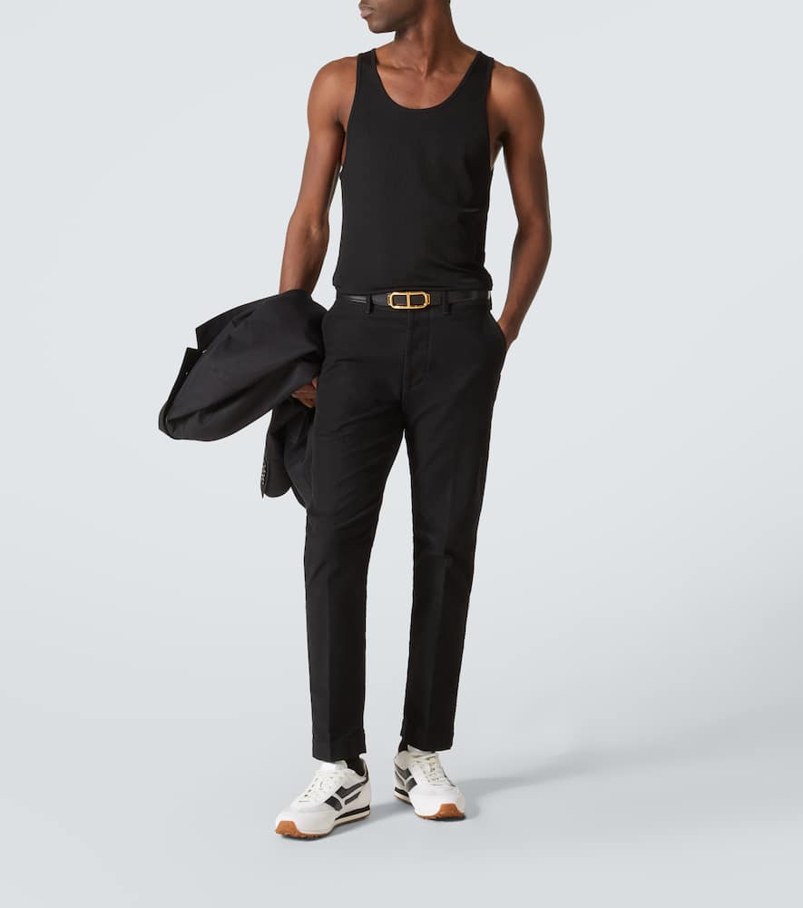 Upper: fabric. Lining: fabric. Sole: fabric insole, rubber sole. Toe shape: almond toe. Made in Italy. Includes: shoe box, dust bags, extra laces. Designer color name: Optical White/Black+ Amber. Trim: leather. Closure: lace-up. Shop Tom Ford Low-Top Sneakers for men and other designer shoes now.