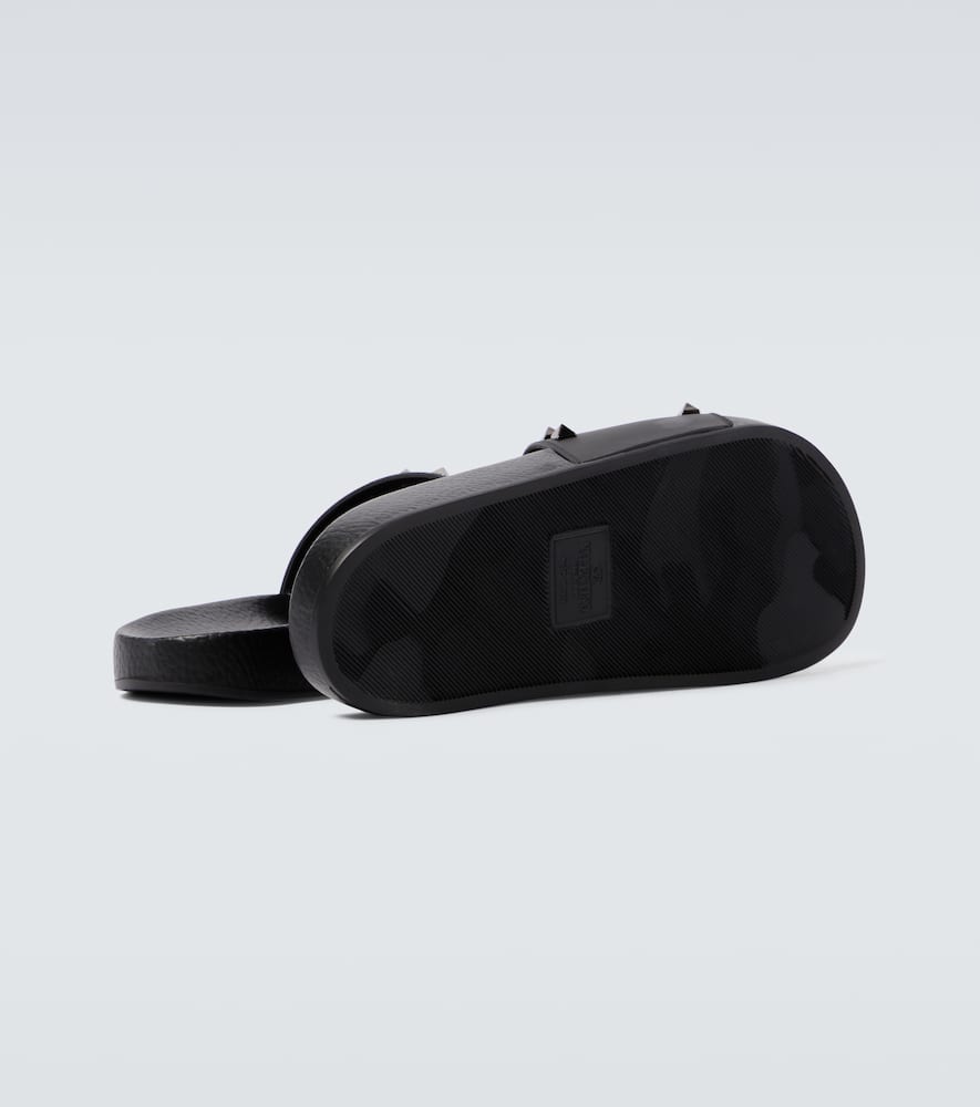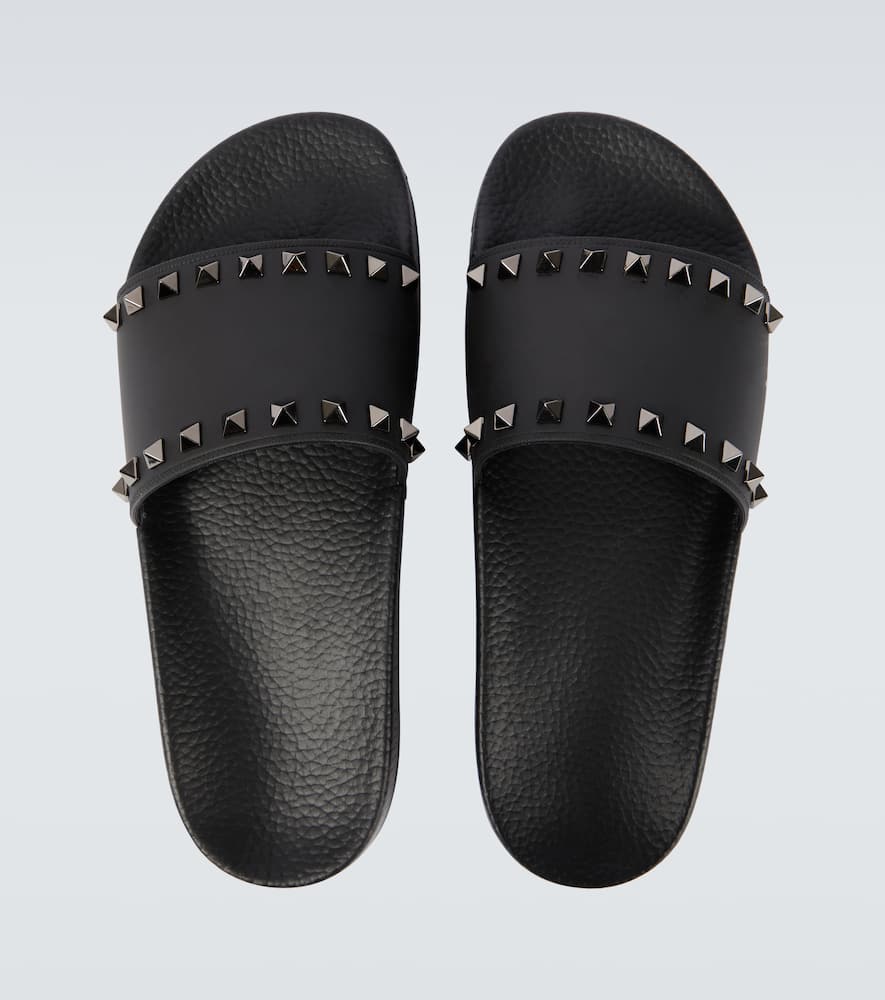 Upper: rubber. Lining: rubber. Sole: rubber insole and sole. Toe shape: round open toe. Made in Italy. Includes: shoe box. Designer color name: Nero. Hardware color: anthracite. Shop Valentino Garavani Sandals & Slides for men and other designer shoes now.