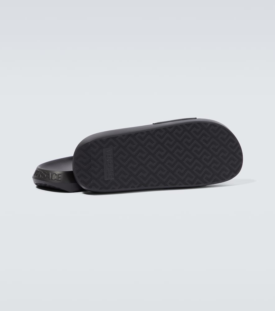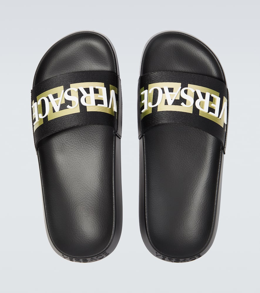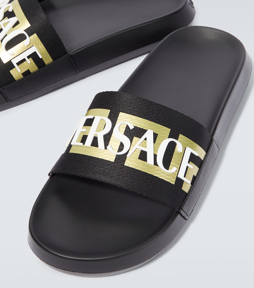 Toe shape: round open toe. Upper: fabric. Trim: leather. Lining: fabric. Comes with a box. Designer color name: Nero+Oro. Sole: rubber insole and sole. Made in Italy. Comes with dust bag. Shop Versace Sandals & Slides for men and other designer shoes now.