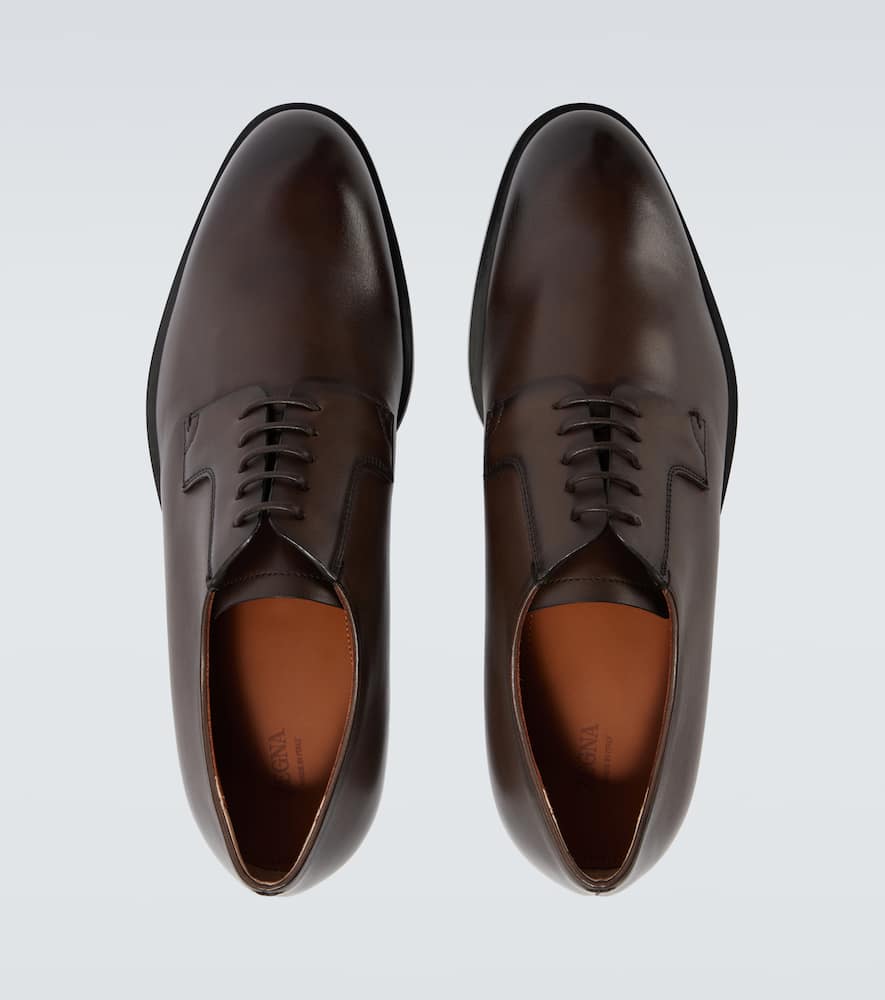 Upper: leather. Lining: leather. Sole: leather insole, rubber sole. Toe shape: almond toe. Made in Italy. Includes: shoe box, dust bags. Designer color name: Dark Brown. Closure: lace-up. Shop Zegna Derby for men and other designer shoes now.