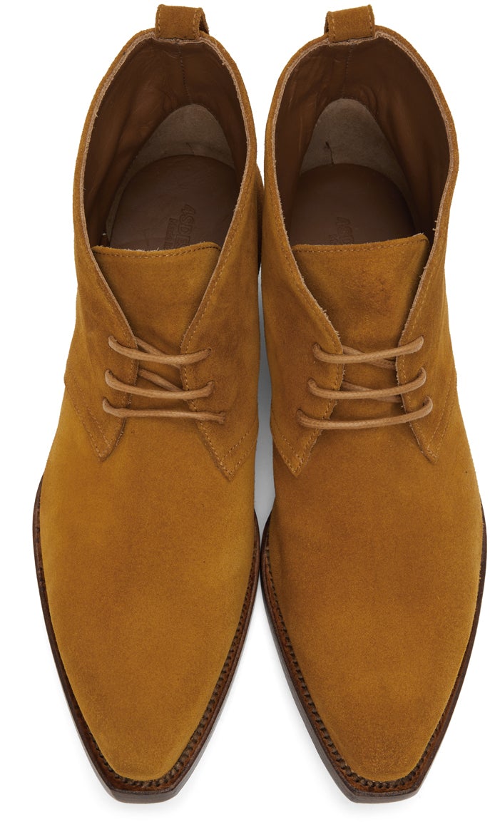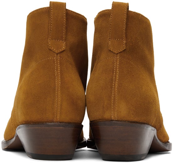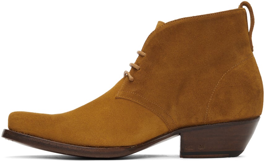 Ankle-high suede boots in tan. Almond toe. Tonal lace-up closure. Tonal buffed leather lining. Brown Cuban heel. Leather sole in brown. Approx. 1.5 heel. Supplier color: Sand Leather. Brand: 4SDESIGNS