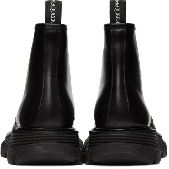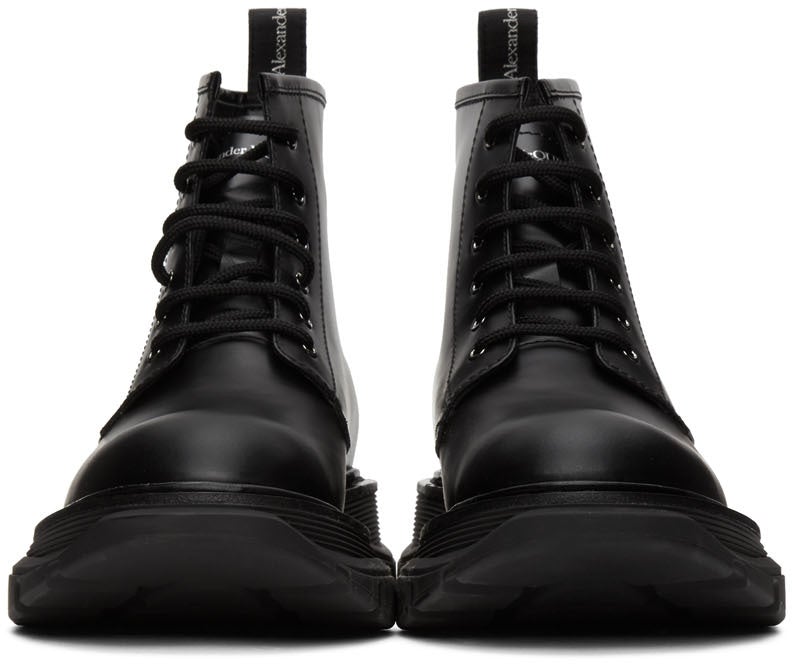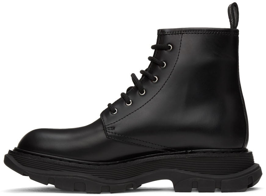 Ankle-high buffed calfskin boots in black. Round toe. Tonal lace-up closure. Logo stamp in silver-tone at tongue. Logo webbing pull-loop at heel. Tonal textured rubber sole. Silver-tone hardware. Supplier color: Black Upper: calfskin. Sole: rubber. Brand: Alexander McQueen