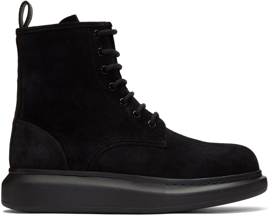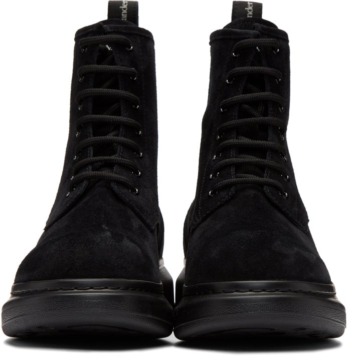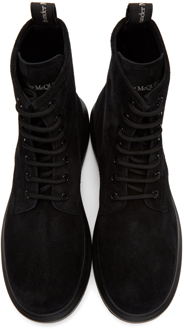 Ankle-high suede boots in black. Round toe. Tonal lace-up closure. Silver-tone logo stamp at tongue. Webbing pull loop featuring logo embroidered in silver-tone at heel collar. Tonal textured rubber midsole. Tonal treaded rubber outsole. Tonal hardware. Supplier color: Black Upper: leather. Sole: rubber. Brand: Alexander McQueen