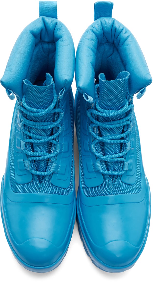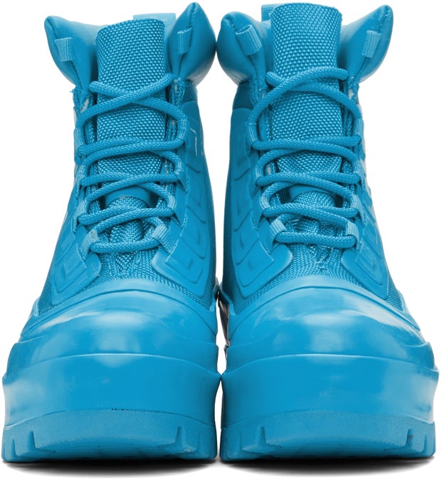 Ankle-high paneled canvas and rubber boots in blue. Round rubber cap toe. Tonal lace-up closure. Faux-leather padded collar. Webbing pull-loop at heel collar. Tonal faux-suede lining. Logo and text printed in black at heel. Tonal rubberized logo appliqué at outer sides. Tonal rubber midsole featuring rubberized logo at heel. Tonal treaded rubber outsole. Tonal hardware. Approx. 1.5 platform. Part of the Ambush x Converse collaboration. Supplier color: Blithe Upper: textile. Sole: rubber. Brand: AMBUSH