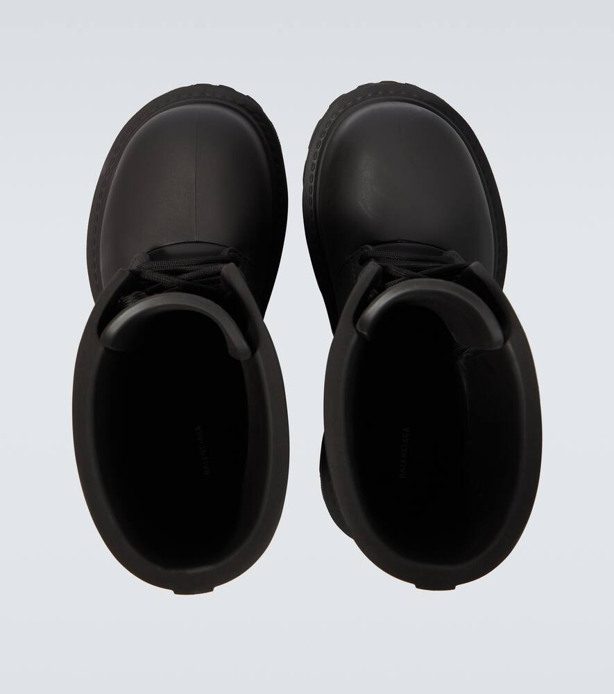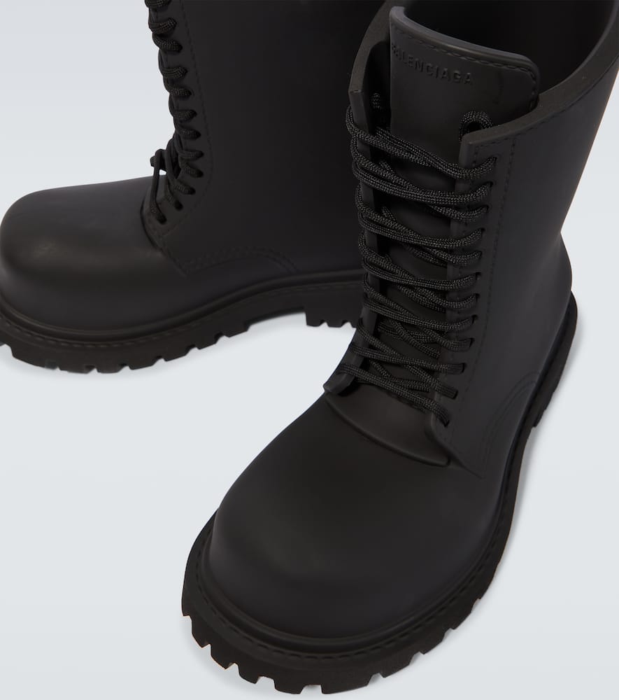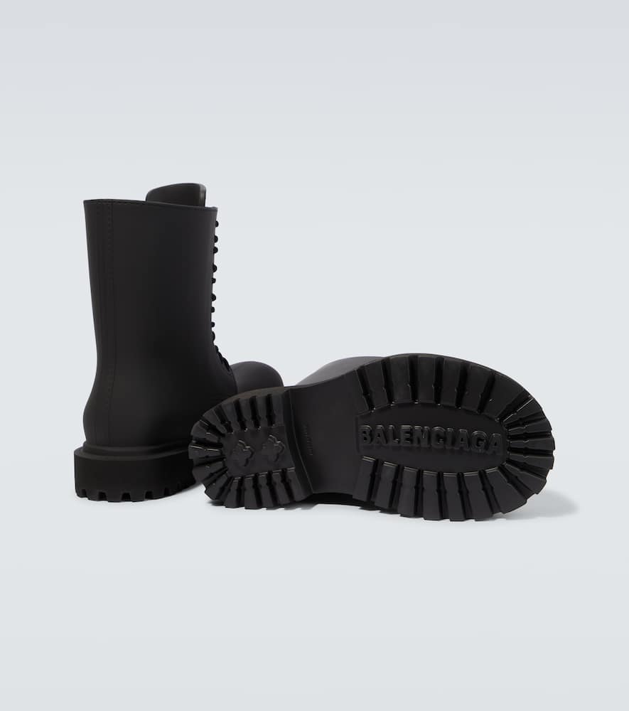 Lining: rubber. Toe shape: round toe. Sole: fabric insole, rubber sole. Upper: rubber. Closure: lace-up. Designer color name: Black. Comes with a box. Made in Italy. Comes with dust bag. Shop Balenciaga Lace Up Boots for men and other designer shoes now.