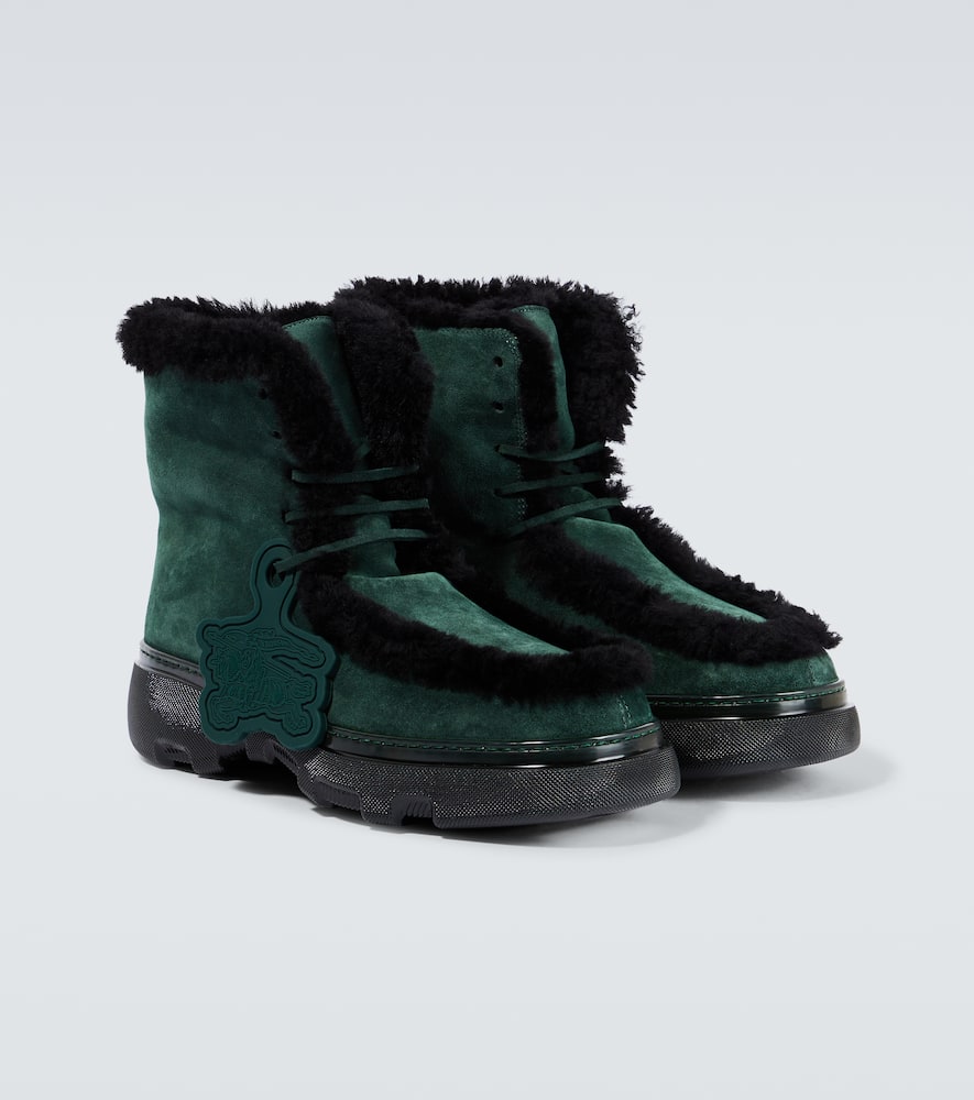 Upper: leather. Lining: shearling. Sole: fabric insole, rubber sole. Toe shape: round toe. Made in Italy. Includes: shoe box, dust bags. Designer color name: Vine/Black. Trim: shearling. Closure: lace-up. Shop Burberry Hiking Boots for men and other designer shoes now.