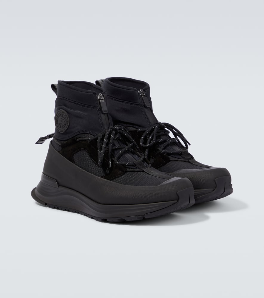 Upper: fabric. Lining: fabric. Sole: fabric insole, rubber sole. Toe shape: almond toe. Made in Portugal. Designer color name: Black. Closure: lace-up. Comes with a box. Trim: leather. Shop Canada Goose Hiking Boots for men and other designer shoes now.