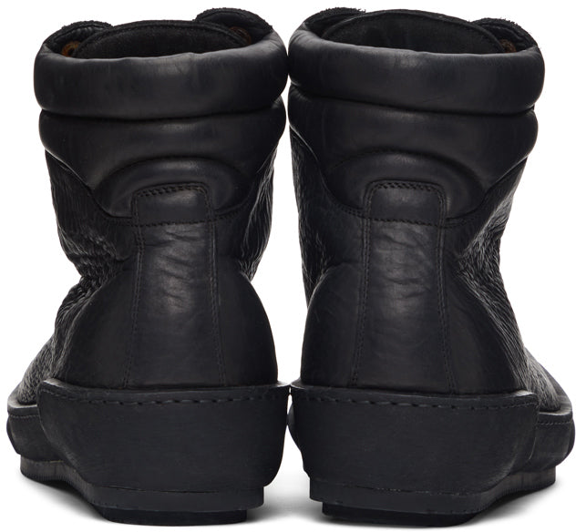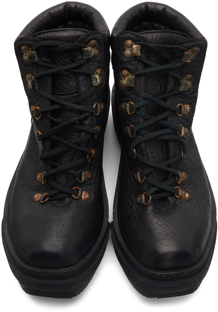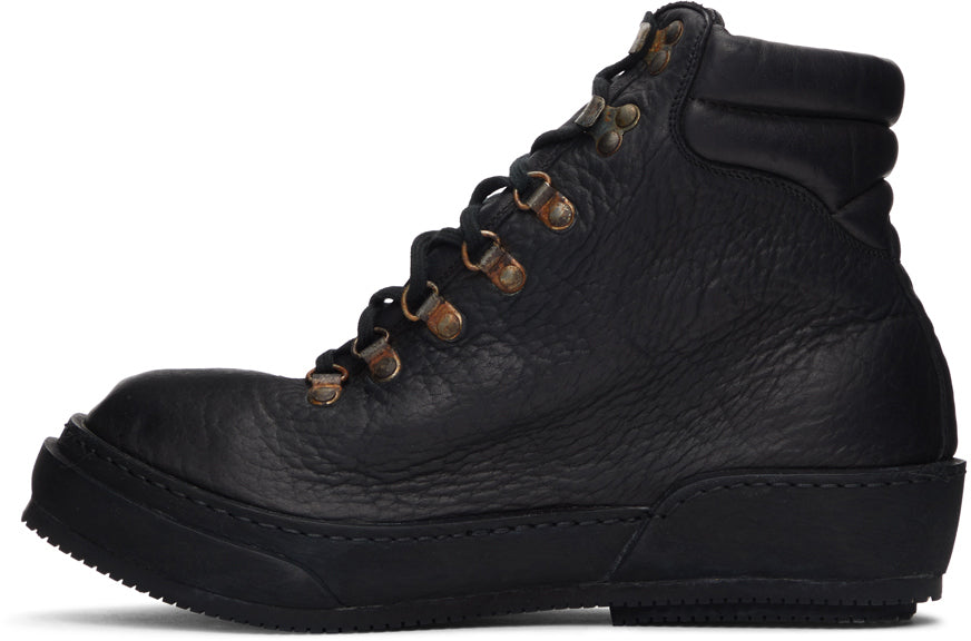 Handcrafted ankle-high grained bison leather boots in black. Distressing throughout. Round toe. Tonal lace-up closure. Padded tongue. Padded collar. Tonal textured rubber midsole. Tonal treaded Vibram® rubber outsole. Antiqued copper-tone hardware. Supplier color: Black Upper: bison leather. Sole: rubber. Brand: Guidi