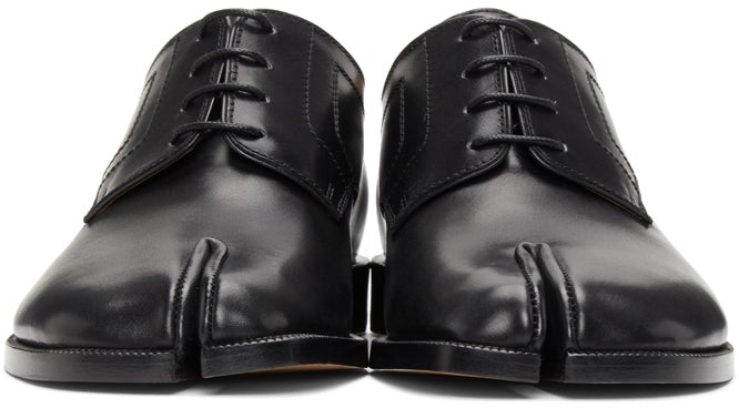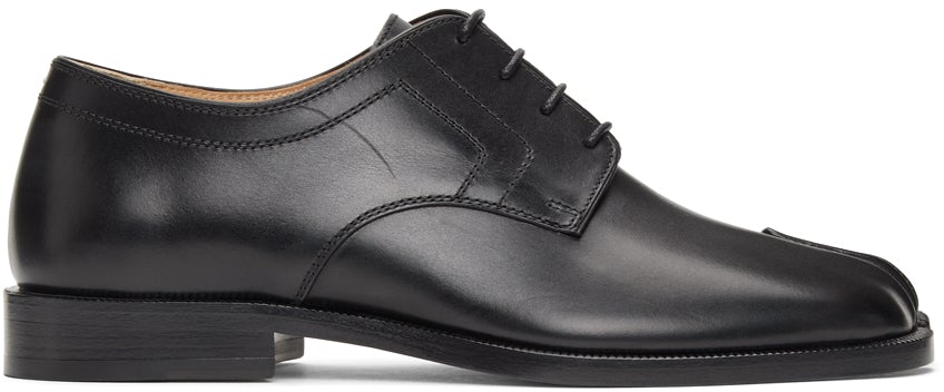 Buffed calfskin derbys in black. Square cleft toe. Tonal lace-up closure. Signature white stitch at heel collar. Buffed leather lining. Leather sole in tan. Supplier color: Black Body: calfskin. Sole: leather. Brand: Maison Margiela