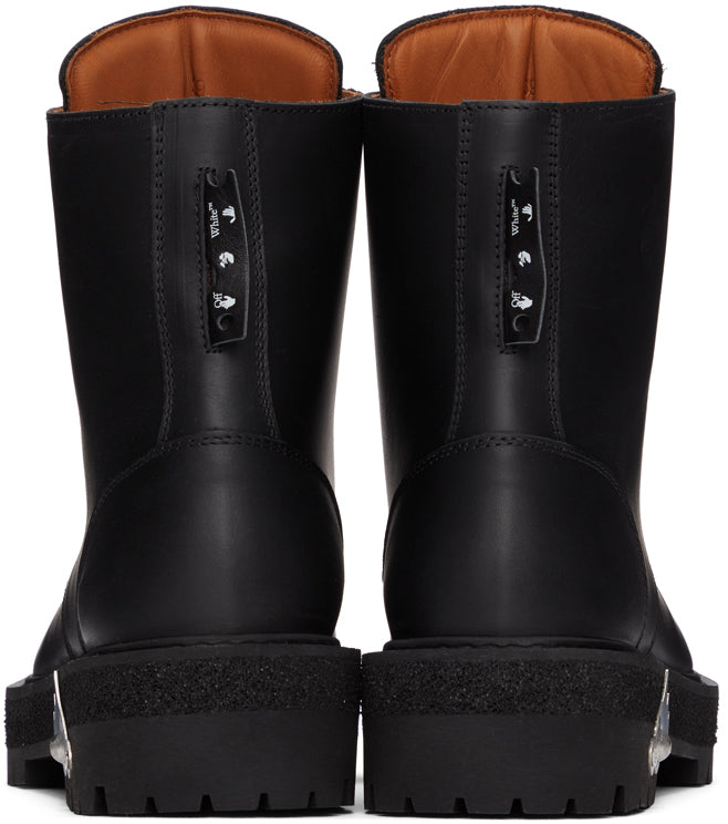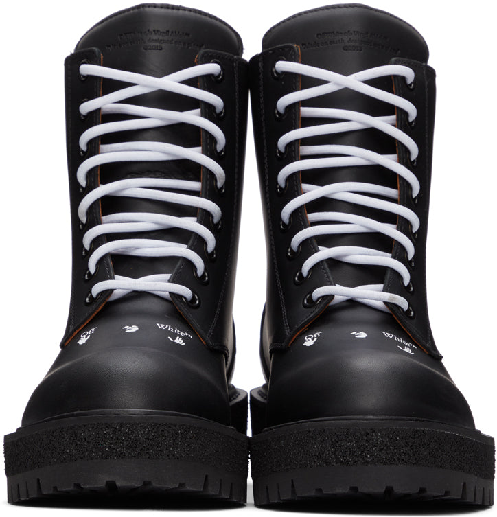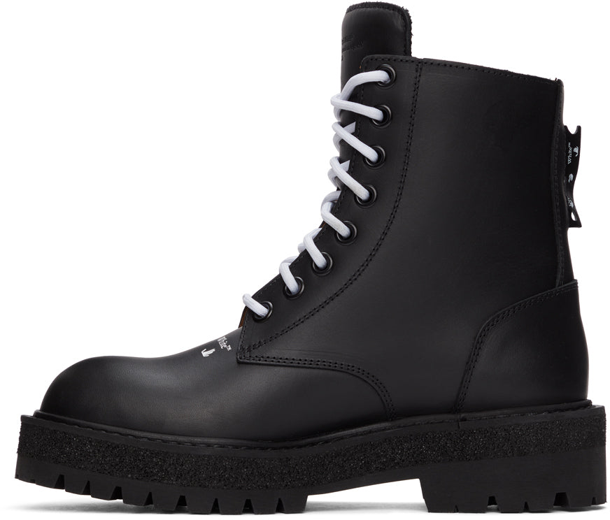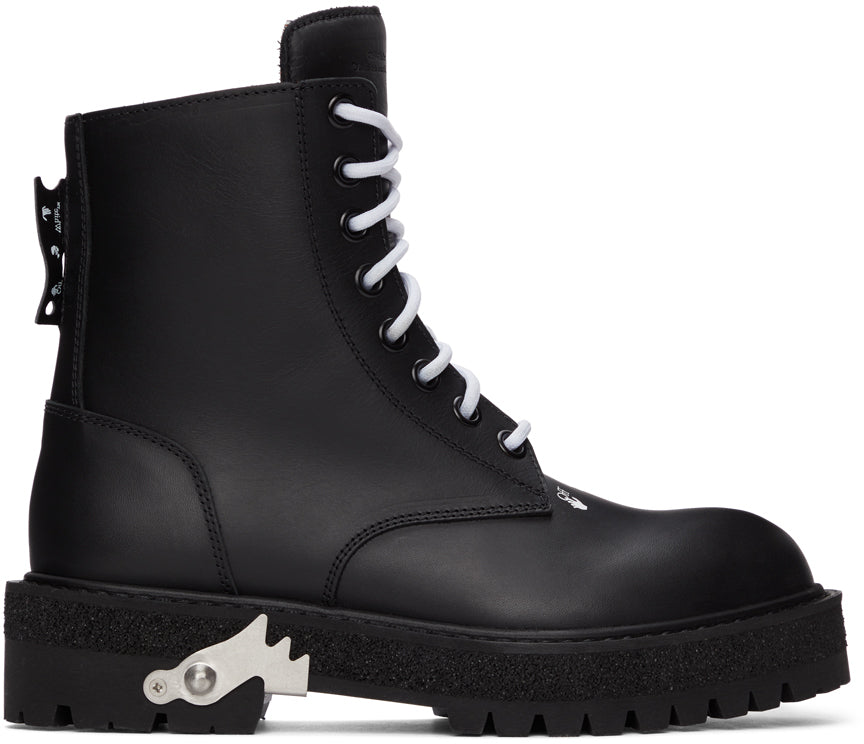 Ankle-high buffed calfskin boots in black. Round toe. Logo printed in white at vamp. Lace-up closure in white. Embossed logo at padded tongue. Leather logo flag at heel. Tonal crepe rubber midsole featuring graphic hardware at outer side. Tonal treaded rubber outsole. Approx. 1.5 platform. Supplier color: Black/No color Upper: calfskin. Sole: rubber. Brand: Off-White