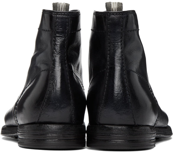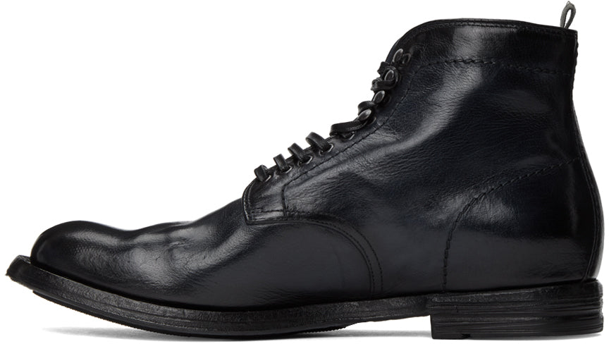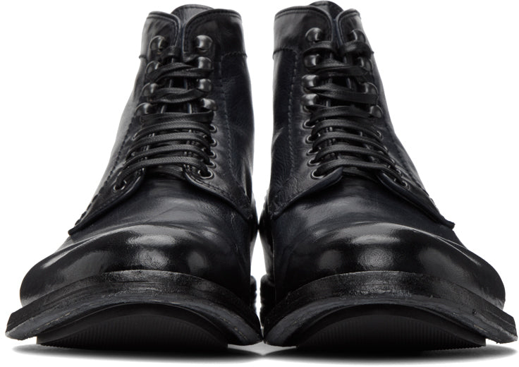 Ankle-high paneled buffed leather boots in navy. Almond toe. Tonal lace-up closure. Textile pull-loop in grey at heel collar. Tonal treaded rubber sole. Supplier color: Navy Upper: leather. Sole: leather, rubber. Brand: Officine Creative