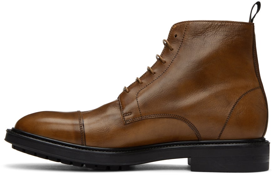 Ankle-high grained polished calfskin boots in tan. Almond toe. Tonal lace-up closure. Grosgrain pull-loop in black at heel collar. Leather lining. Treaded rubber sole in black. Supplier color: Tan Upper: calfskin. Sole: rubber. Brand: Paul Smith