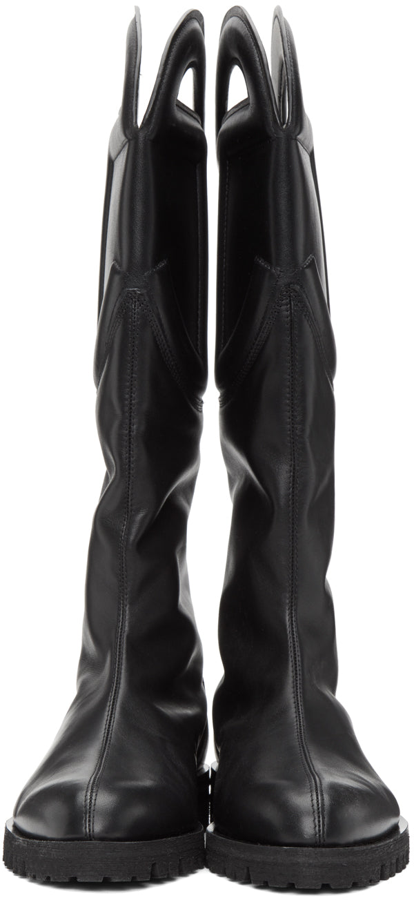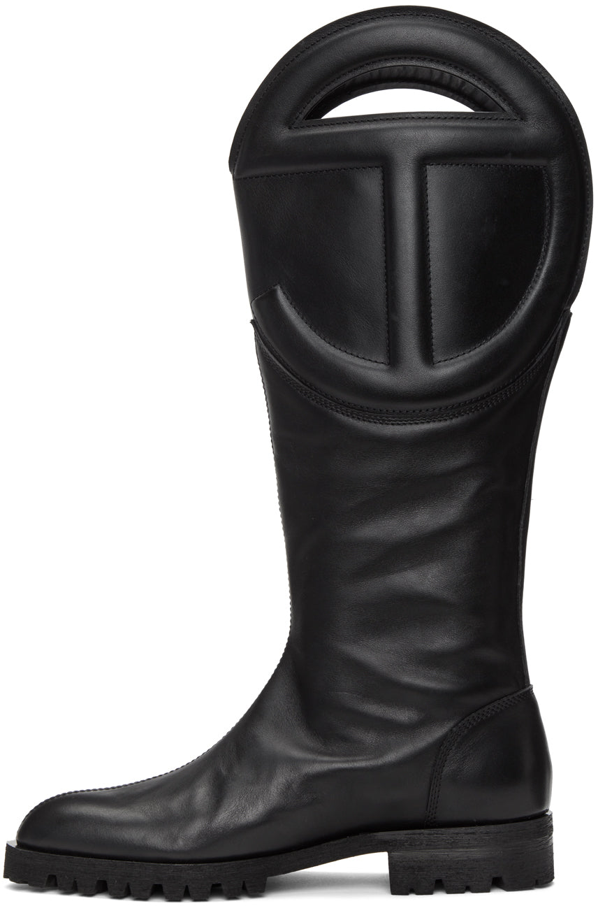 Knee-high grained leather boots in black. Pointed toe. Embossed logo at sides. Cut-out pull loops at top. Tonal treaded Vibram® rubber sole. Supplier color: Black Upper: leather. Sole: rubber. Brand: Telfar