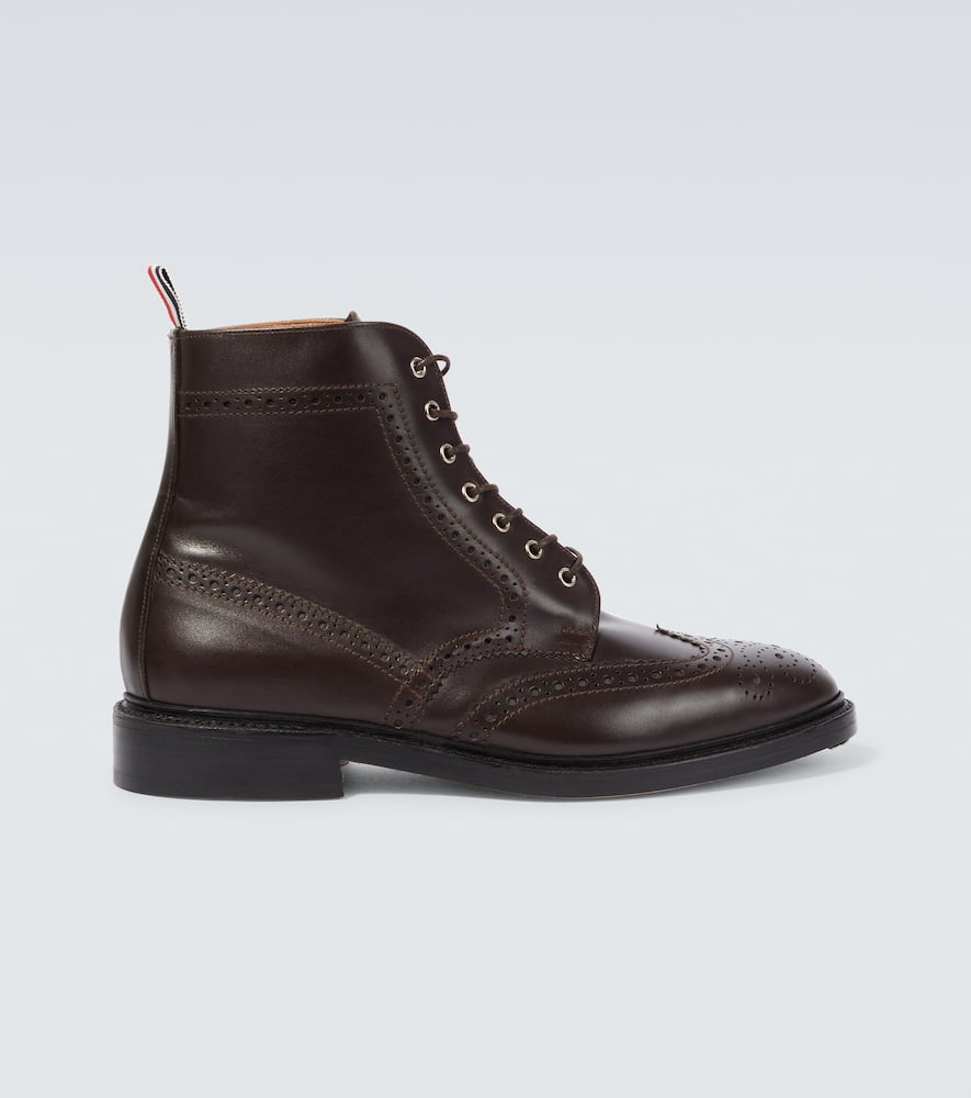 Upper: calf leather. Lining: leather. Sole: leather insole and sole. Toe shape: round toe. Made in the UK. Includes: dust bags, dust bag. Designer color name: Brown. Closure: lace-up. Shop Thom Browne Lace Up Boots for men and other designer shoes now.