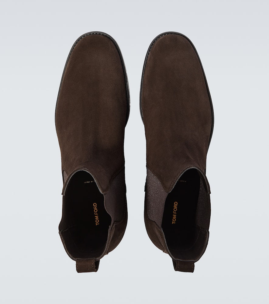 Sole: leather insole, rubber sole. Trim: fabric. Upper: leather. Made in Italy. Designer color name: Chocolate. Toe shape: round toe. Shop Tom Ford Chelsea Boots for men and other designer shoes now.