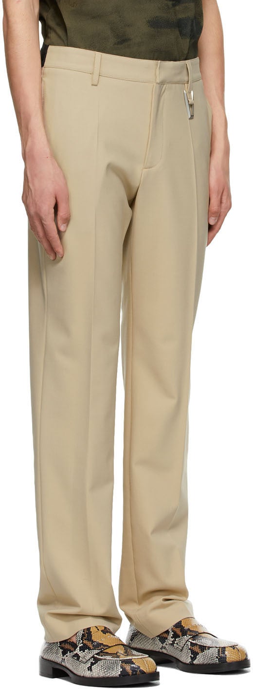Slim-fit stretch plain-woven wool-blend trousers in beige. Mid-rise. Four-pocket styling. Belt loops and logo hardware at front waistband. Logo-woven elasticized webbing trim in black at back waistband. Central crease at front and back legs. Unlined. Zip-fly. Silver-tone hardware. Supplier color: Classic tan 53% polyester, 43% wool, 4% elastane. Brand: 1017 ALYX 9SM