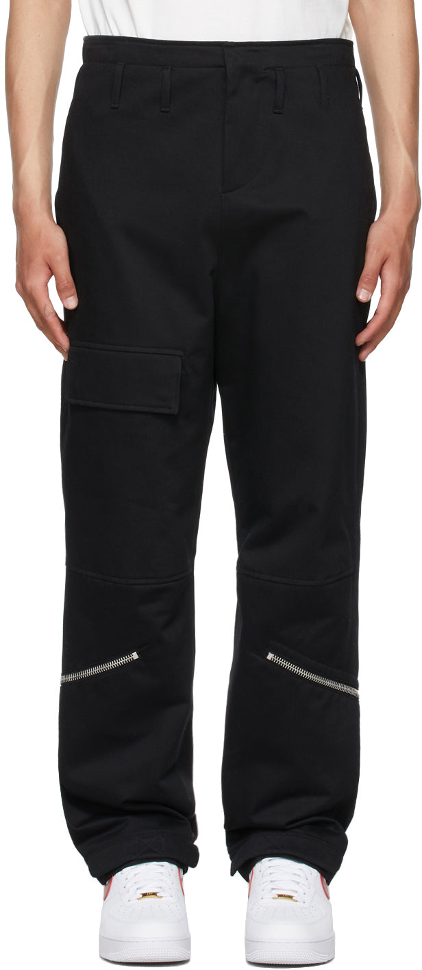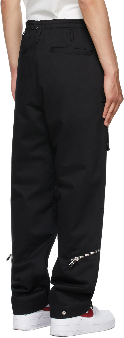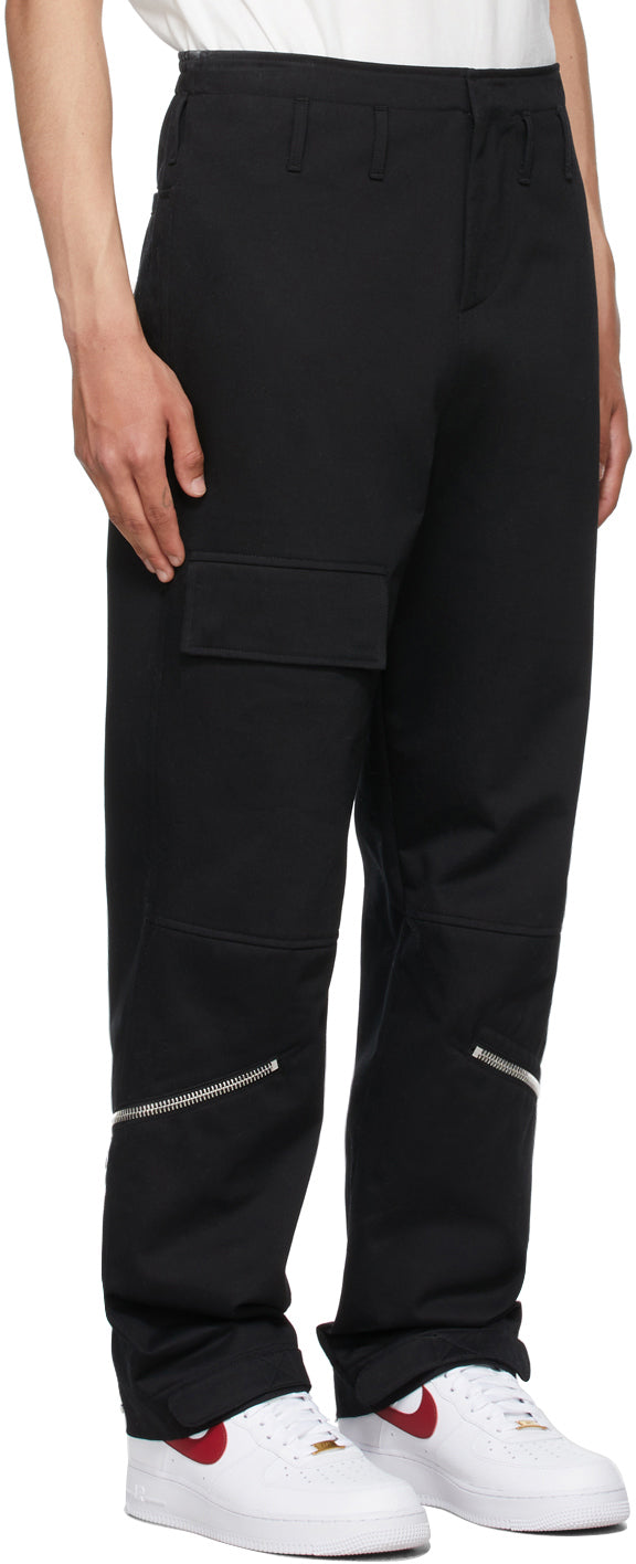 Straight-leg cotton canvas cargo pants in black. Mid-rise. Four-pocket styling. Belt loops at partially elasticized waistband. Flap pocket with press-stud fastening and zippered pockets at outseams. Concealed press-stud fastening at cuffs for alternate styling. Zip-fly. Tonal cotton twill lining. Logo-engraved silver-tone hardware. Supplier color: Black Body: 100% cotton. Lining: 100% cotton. Brand: 424