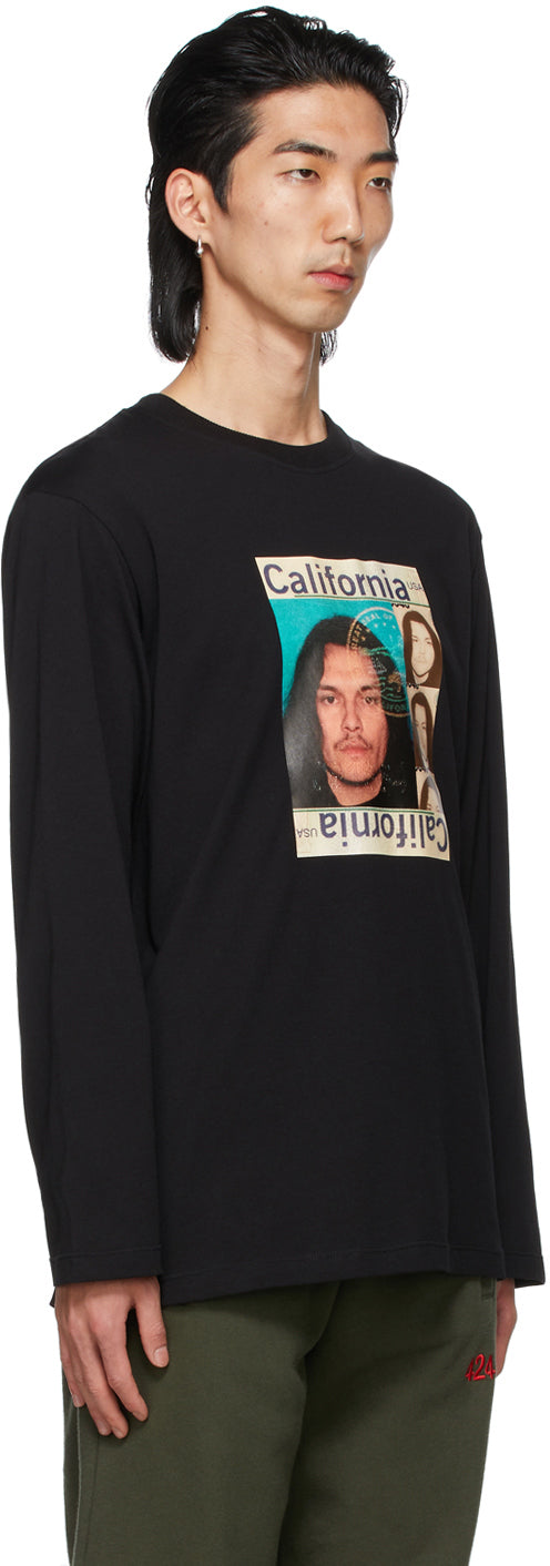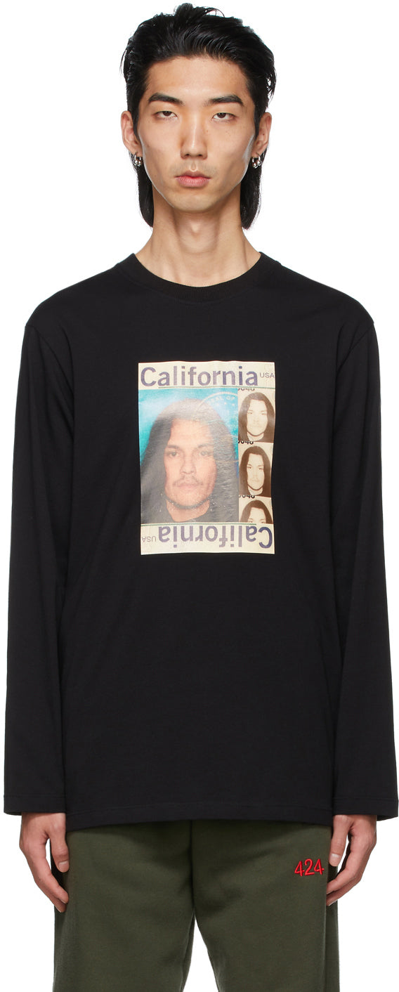 Long sleeve cotton jersey T-shirt in black. Rib knit crewneck collar. Graphic printed in multicolor at front. Supplier color: Black 100% cotton. Brand: 424