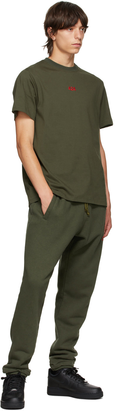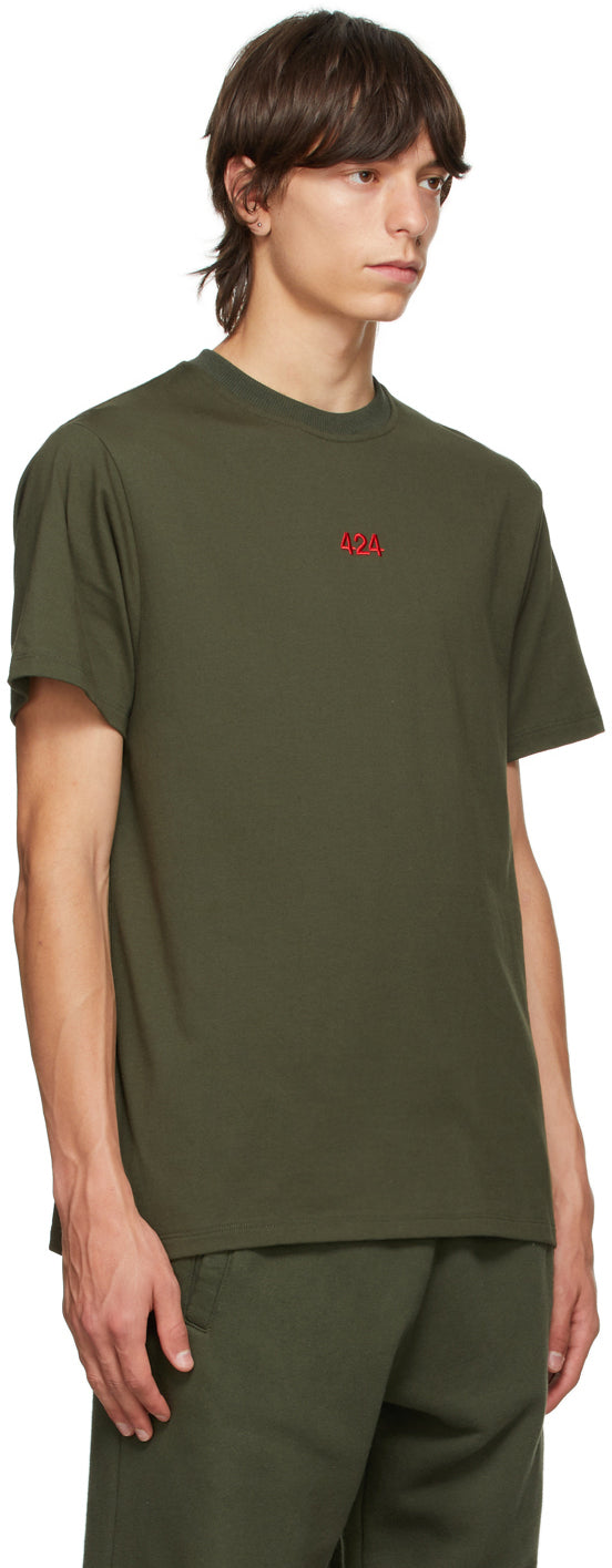 Short sleeve cotton jersey T-shirt in green. Rib knit crewneck collar. Logo embroidered in red at chest. Supplier color: Green 100% cotton. Brand: 424