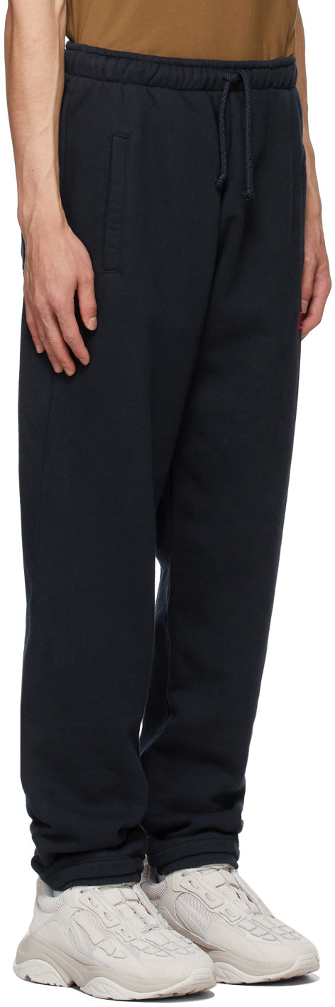 Relaxed-fit cotton fleece lounge pants in navy. Mid-rise. Three-pocket styling. Drawstring at elasticized waistband. Logo embroidered in red at front. Inset rib knit cuffs. Supplier color: Blue 100% cotton. Brand: 424