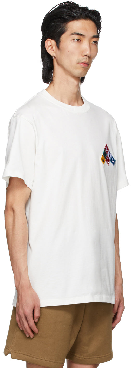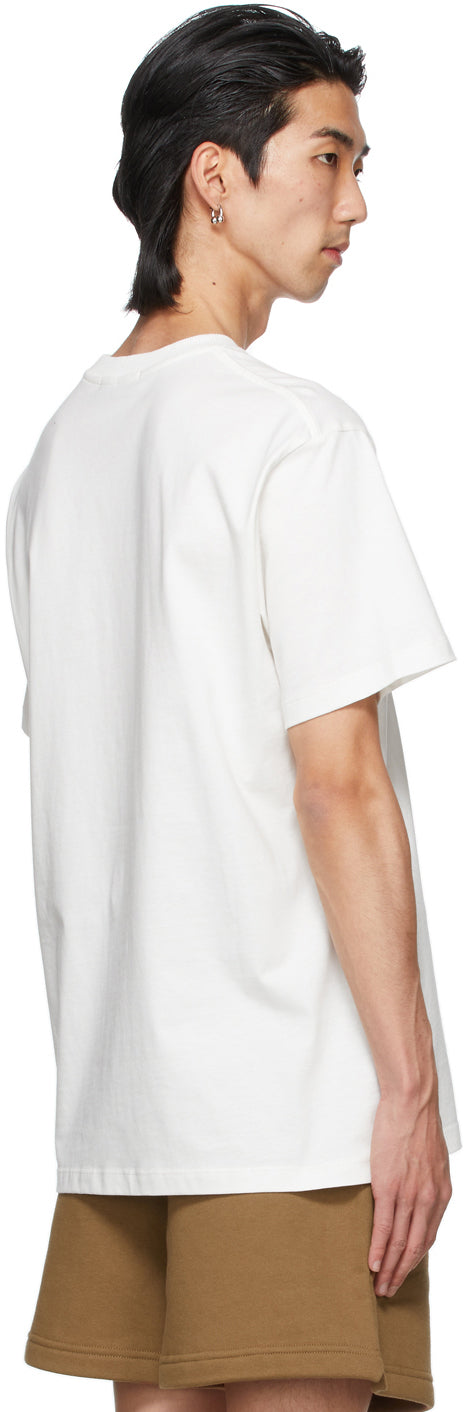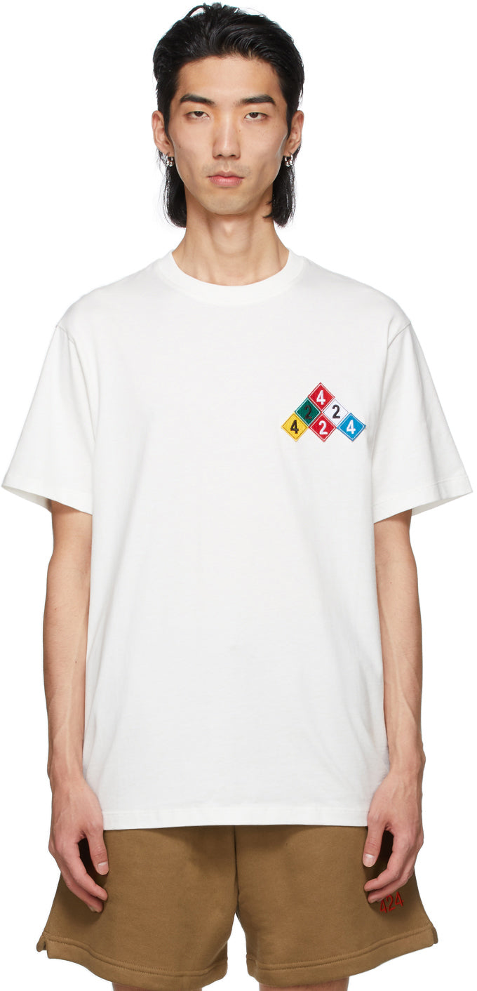 Short sleeve cotton jersey T-shirt in white. Rib knit crewneck collar. Embroidered logo appliqué in multicolor at chest. Supplier color: White 100% cotton. Brand: 424