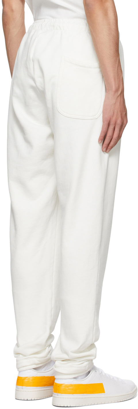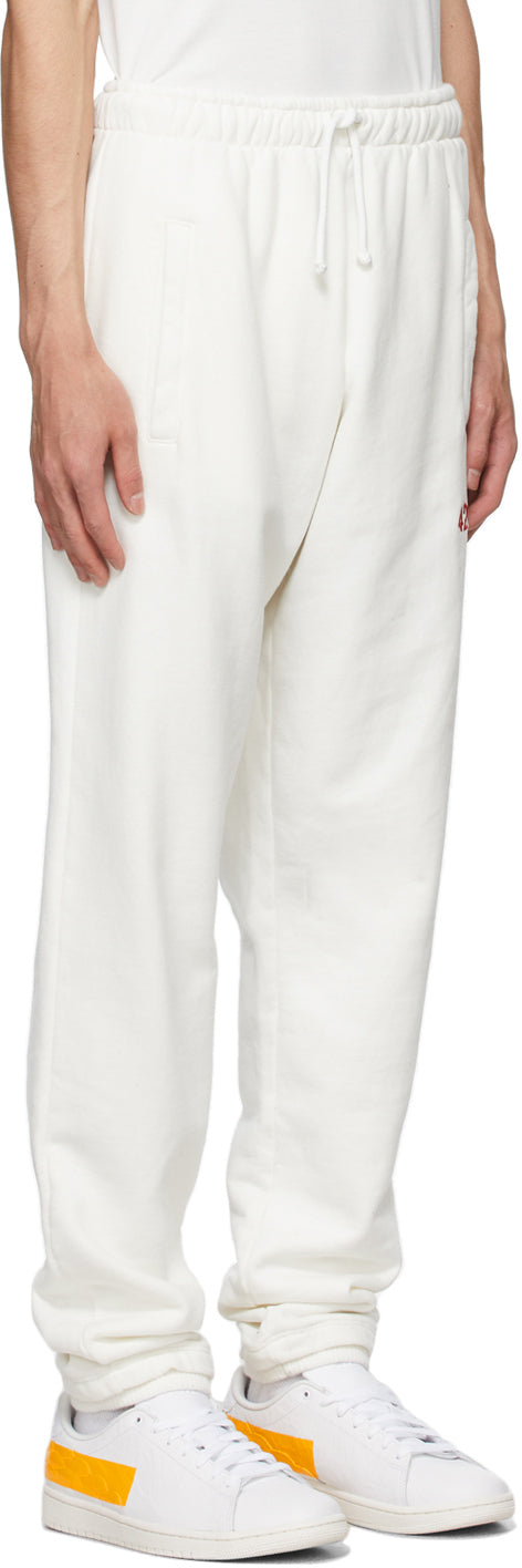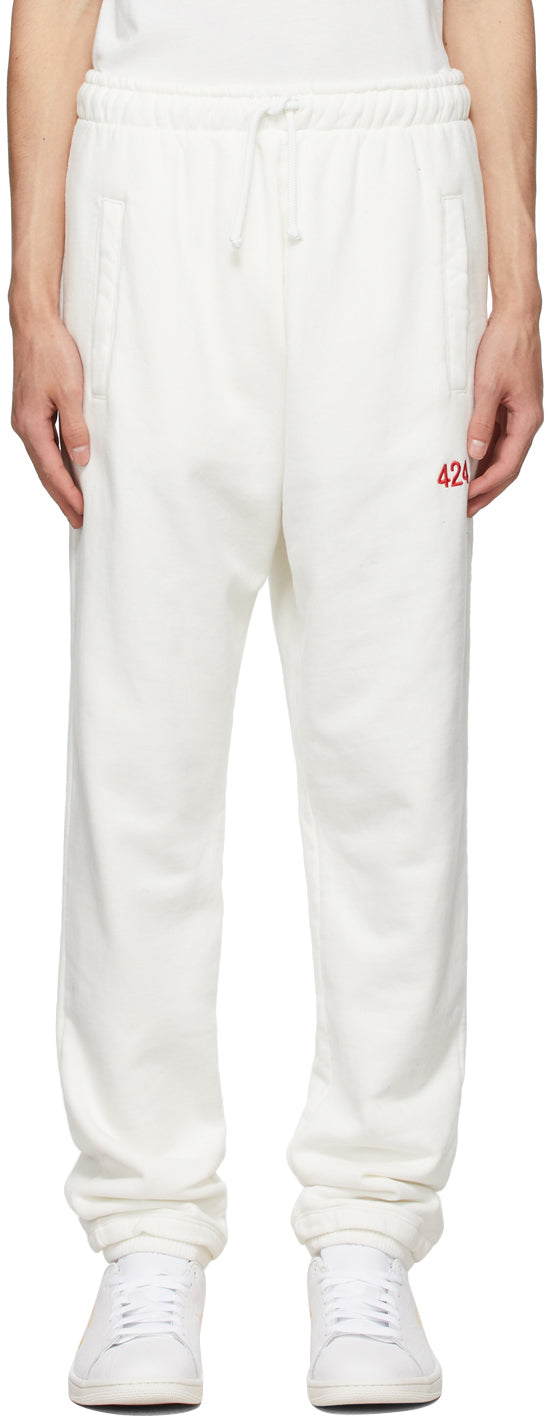 Relaxed-fit cotton fleece lounge pants in white. Mid-rise. Three-pocket styling. Drawstring at elasticized waistband. Logo embroidered in red at front. Inset rib knit cuffs. Supplier color: White 100% cotton. Brand: 424
