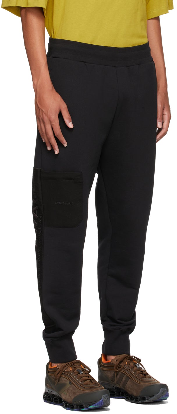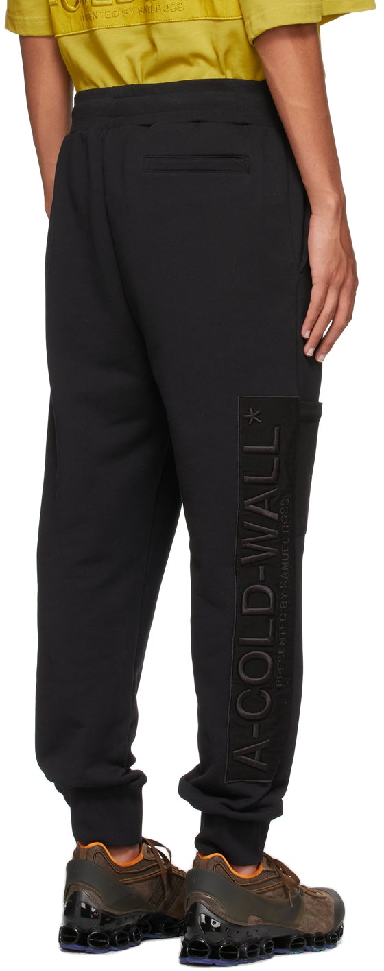 Relaxed-fit French terry lounge pants in black. Mid-rise. Three-pocket styling. Concealed drawstring at elasticized waistband. Zippered pocket at leg. Tonal embroidered logo at front and back. Rib knit cuffs. Tonal hardware. Supplier color: Black 100% cotton. Brand: A-COLD-WALL*