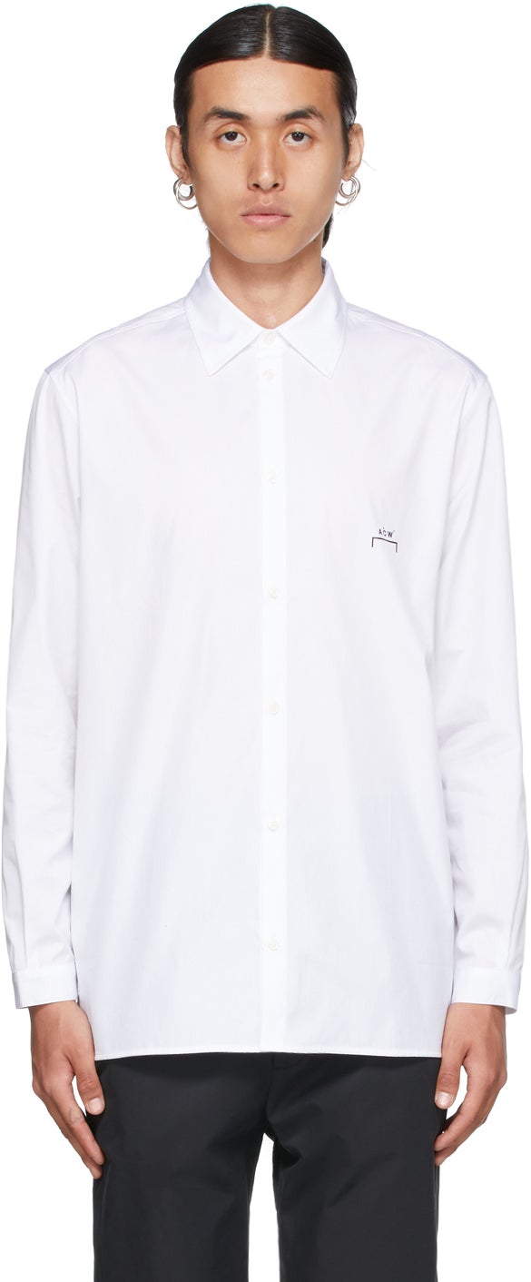 Long sleeve paneled cotton poplin shirt in white. Spread collar. Button closure at front. Logo printed in black at chest. Two-button barrel cuffs. Vent at side-seams. Tonal hardware. Supplier color: White 100% cotton. Brand: A-COLD-WALL*