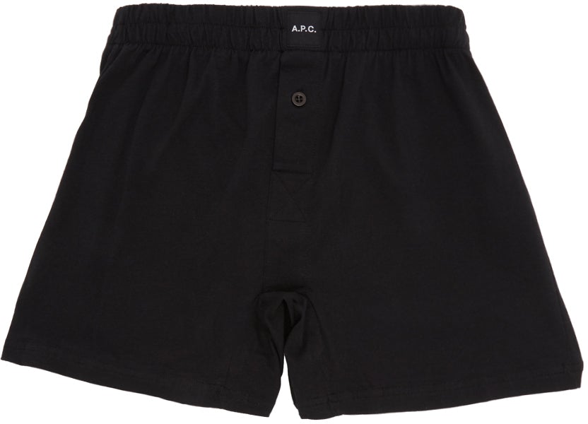 Cotton jersey boxer briefs in black. Mid-rise. Tonal and white textile logo appliqué at elasticized waistband. Button-fly. Tonal hardware. Supplier color: Black 100% cotton. Brand: A.P.C.