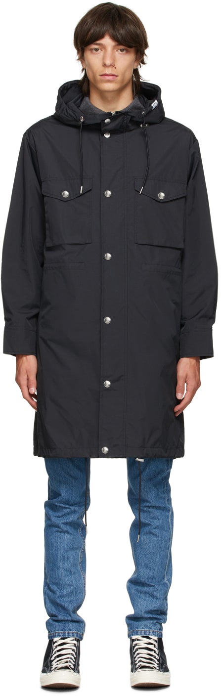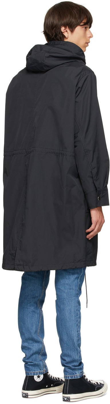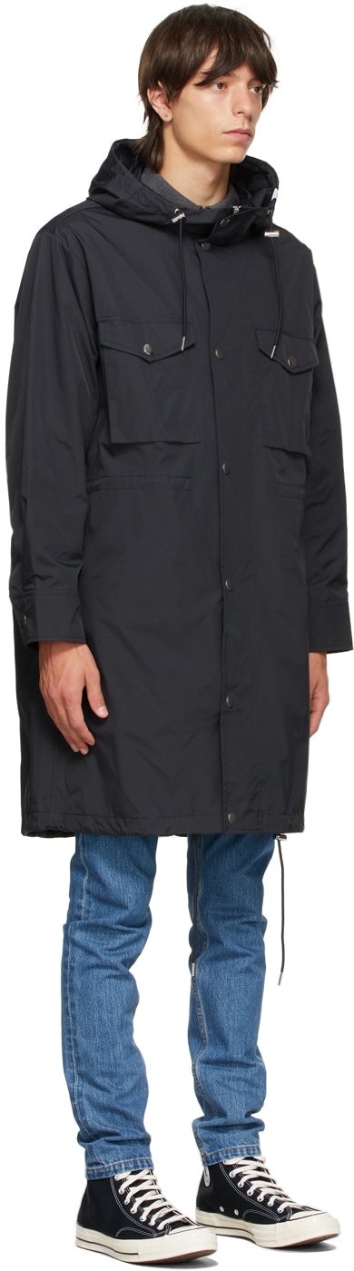 Long sleeve ripstop coat in black. Stand collar. Adjustable drawstring featuring textile logo flag in white at hood. Concealed two-way zip closure with press-stud placket at front. Patch pockets at chest. Welt pockets at waist. Single-button barrel cuffs with press-stud fastening. Concealed adjustable drawstring at waist and hem. Patch pocket at interior. Unlined. Silver-tone hardware. Supplier color: Black 100% polyamide. Brand: A.P.C.