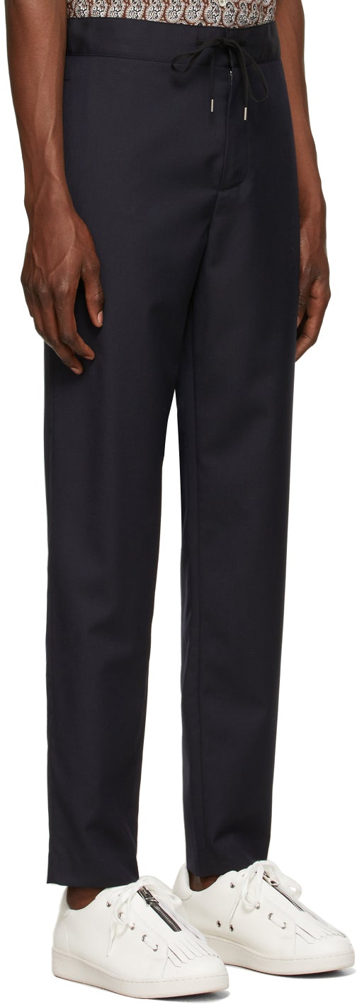 Straight-leg plain-woven wool trousers in navy. Mid-rise. Three-pocket styling. Drawstring at partially-elasticized waistband. Unlined. Zip-fly. Silver-tone hardware. Supplier color: Navy 100% wool. Brand: A.P.C.