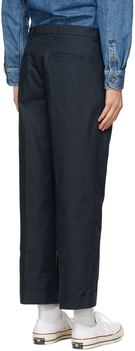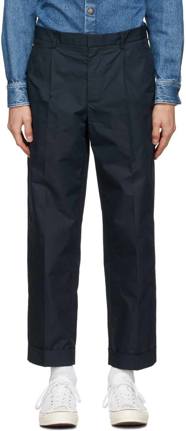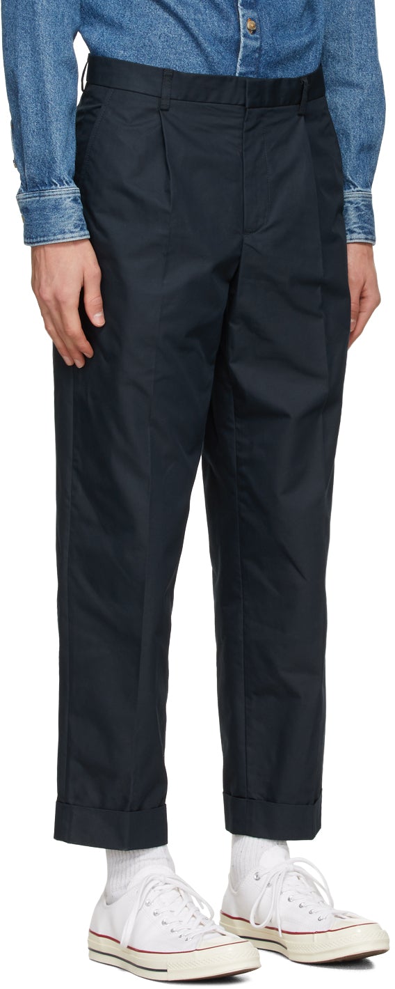 Relaxed-fit cotton and nylon-blend gabardine trousers in navy. Mid-rise. Four-pocket styling. Belt loops at waistband. Pleats at front. Rolled cuffs. Zip-fly. Silver-tone hardware. Supplier color: Navy 66% cotton, 34% polyamide. Brand: A.P.C.