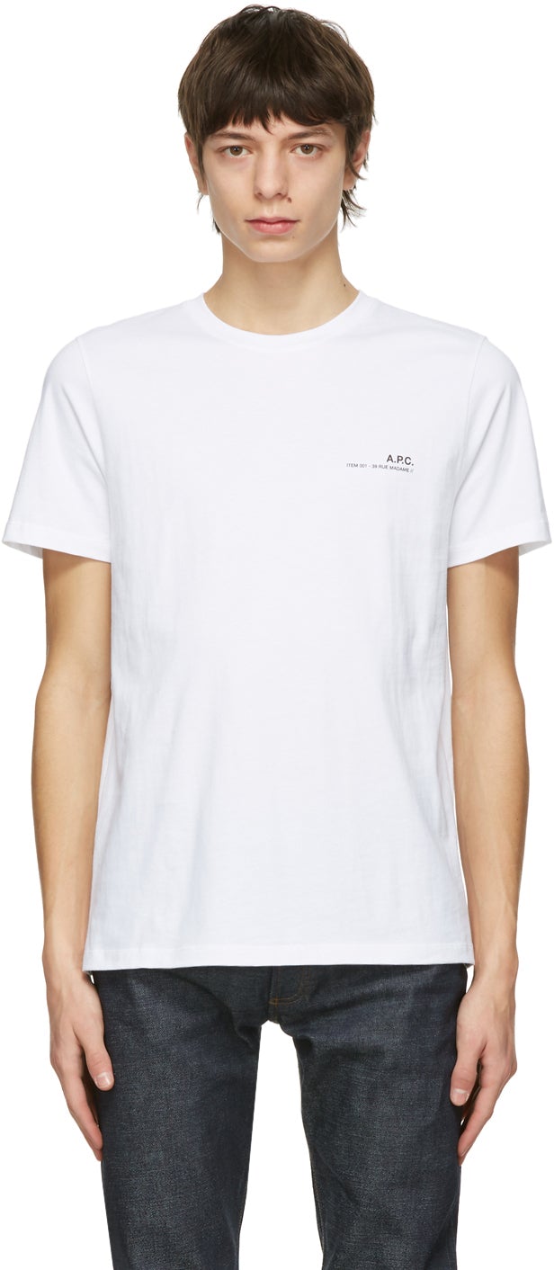 Short sleeve cotton jersey T-shirt in white. Rib knit crewneck collar. Logo printed in black at chest. Supplier color: White 100% cotton. Brand: A.P.C.