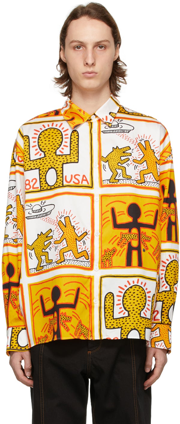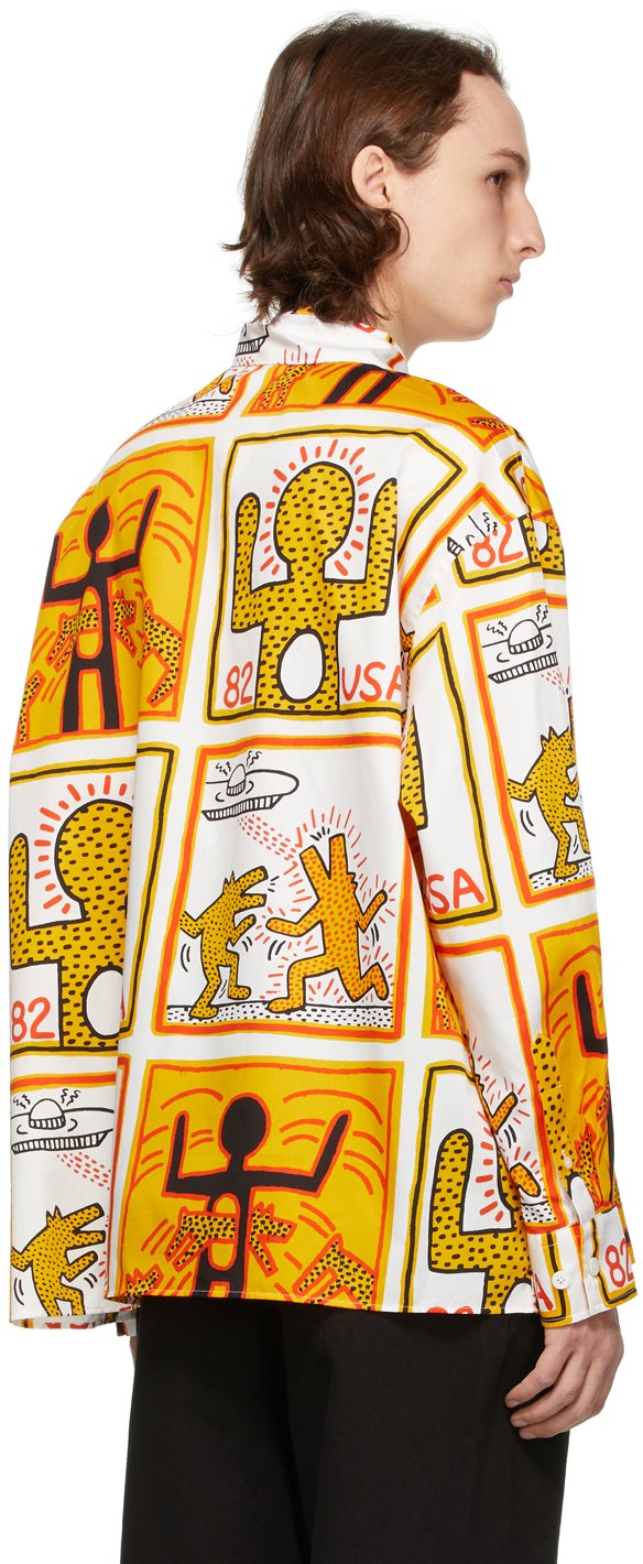 Long sleeve organic cotton poplin shirt in white featuring signature graphic pattern in yellow, red, and black. Spread collar. Button closure at front. Adjustable single-button barrel cuffs. Part of the Études x Keith Haring Foundation collaboration. Supplier color: Keith Haring 100% organic cotton. Brand: Études