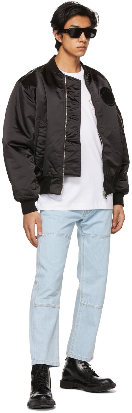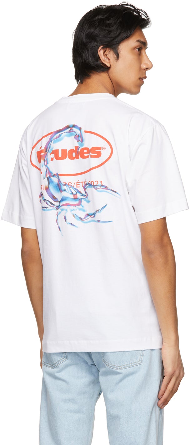 Short sleeve stretch organic cotton jersey T-shirt in white. Rib knit crewneck collar. Logo and text printed in red at chest and back. Graphic printed in multicolor at back. Supplier color: White 85% organic cotton, 15% lyocell. Brand: Études