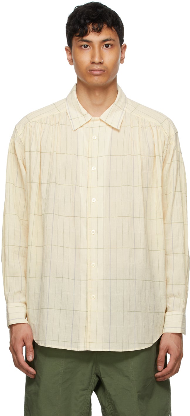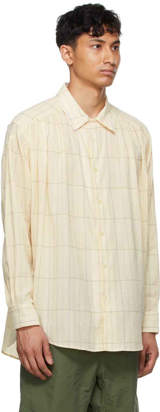 Long sleeve plain-woven cotton shirt in yellow featuring check pattern in blue, black, and green. Spread collar. Button closure at front. Gathering at shoulders and back yolk. Single-button barrel cuffs. Shirttail hem. Tonal hardware. Supplier color: Ivory/Light blue 100% cotton. Brand: AïE