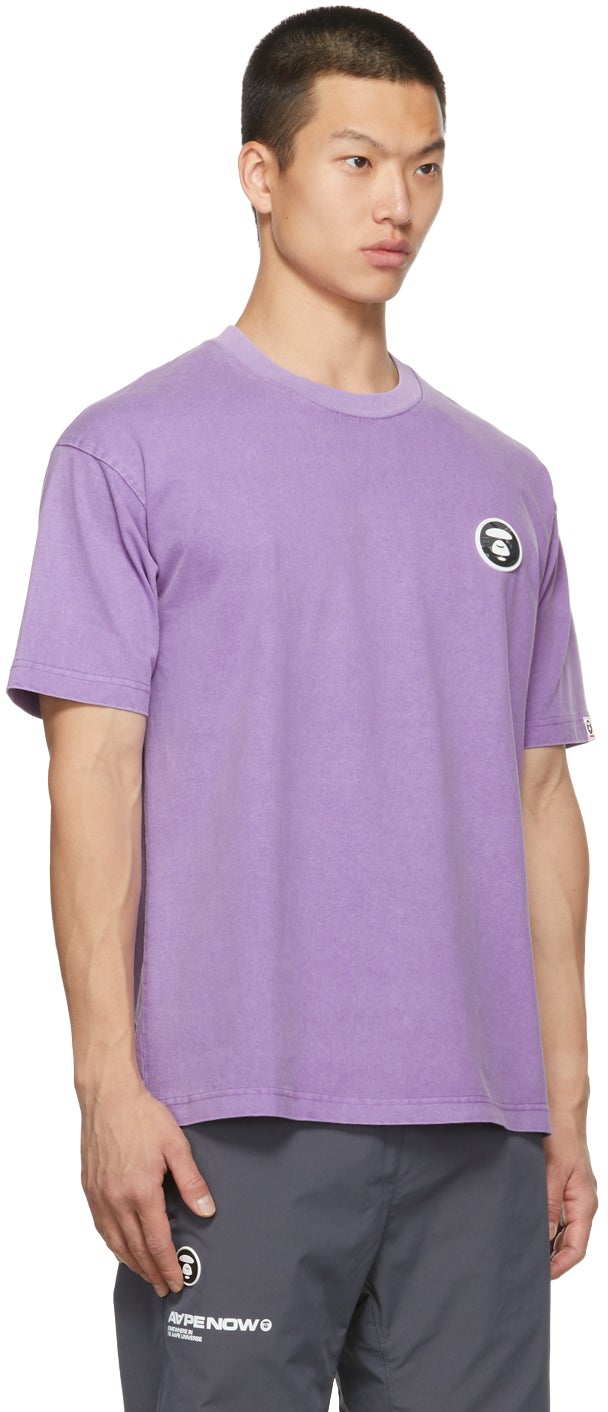 Short sleeve cotton jersey T-shirt in purple. Rib knit crewneck collar. Rubberized logo appliqué in black, grey, and white at chest. Textile logo flags at sleeve. Tonal logo embroidered at back. Supplier color: Purple 100% cotton. Brand: AAPE by A Bathing Ape