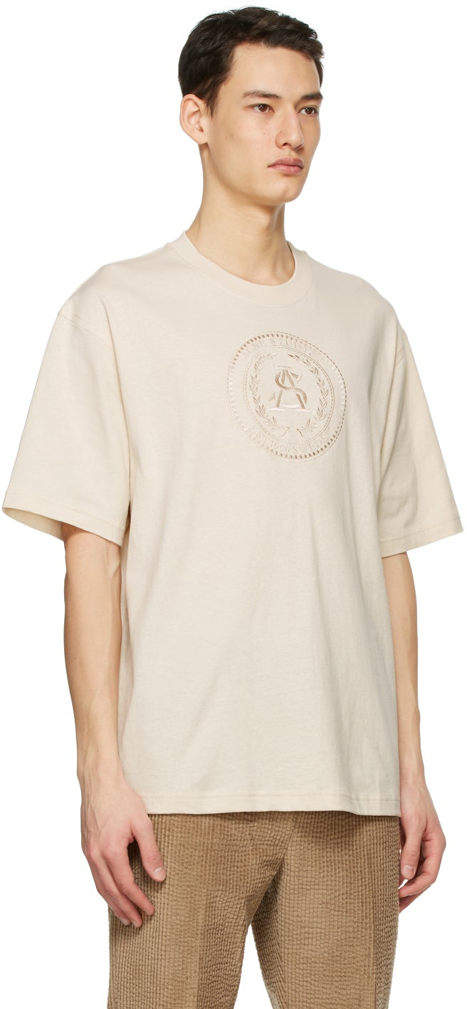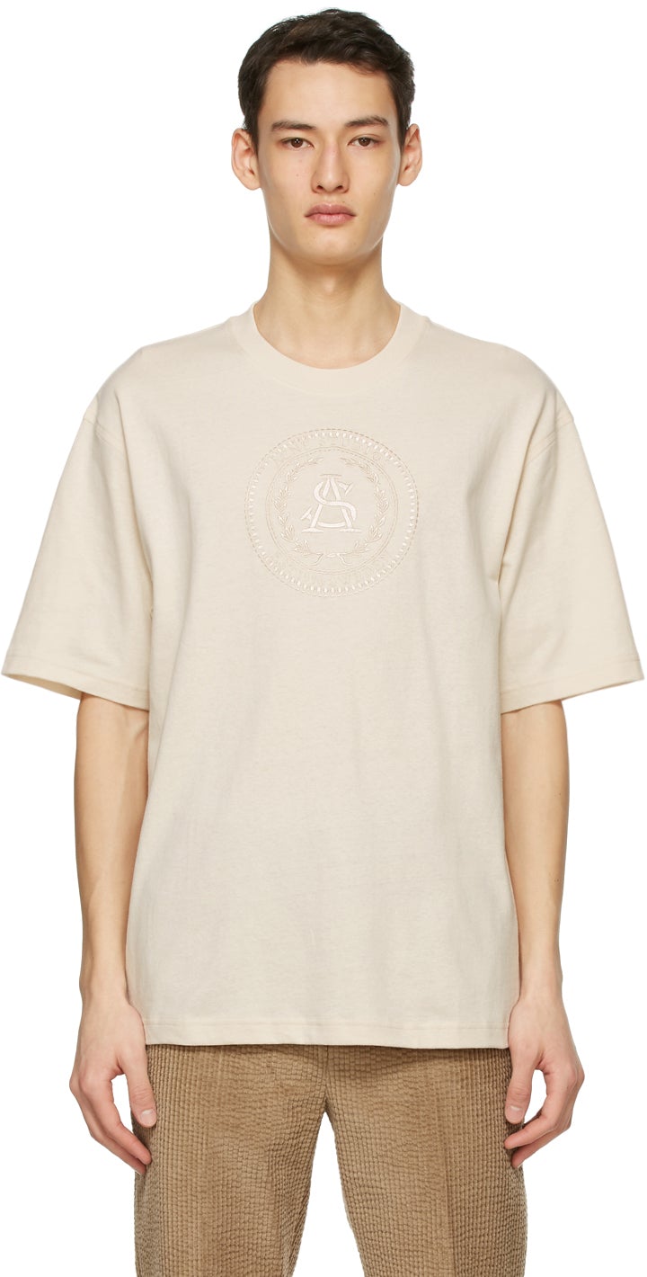 Short sleeve cotton jersey T-shirt in beige. Rib knit crewneck collar. Tonal logo graphic embroidered at front. Supplier color: Coconut white 100% cotton. Brand: Acne Studios