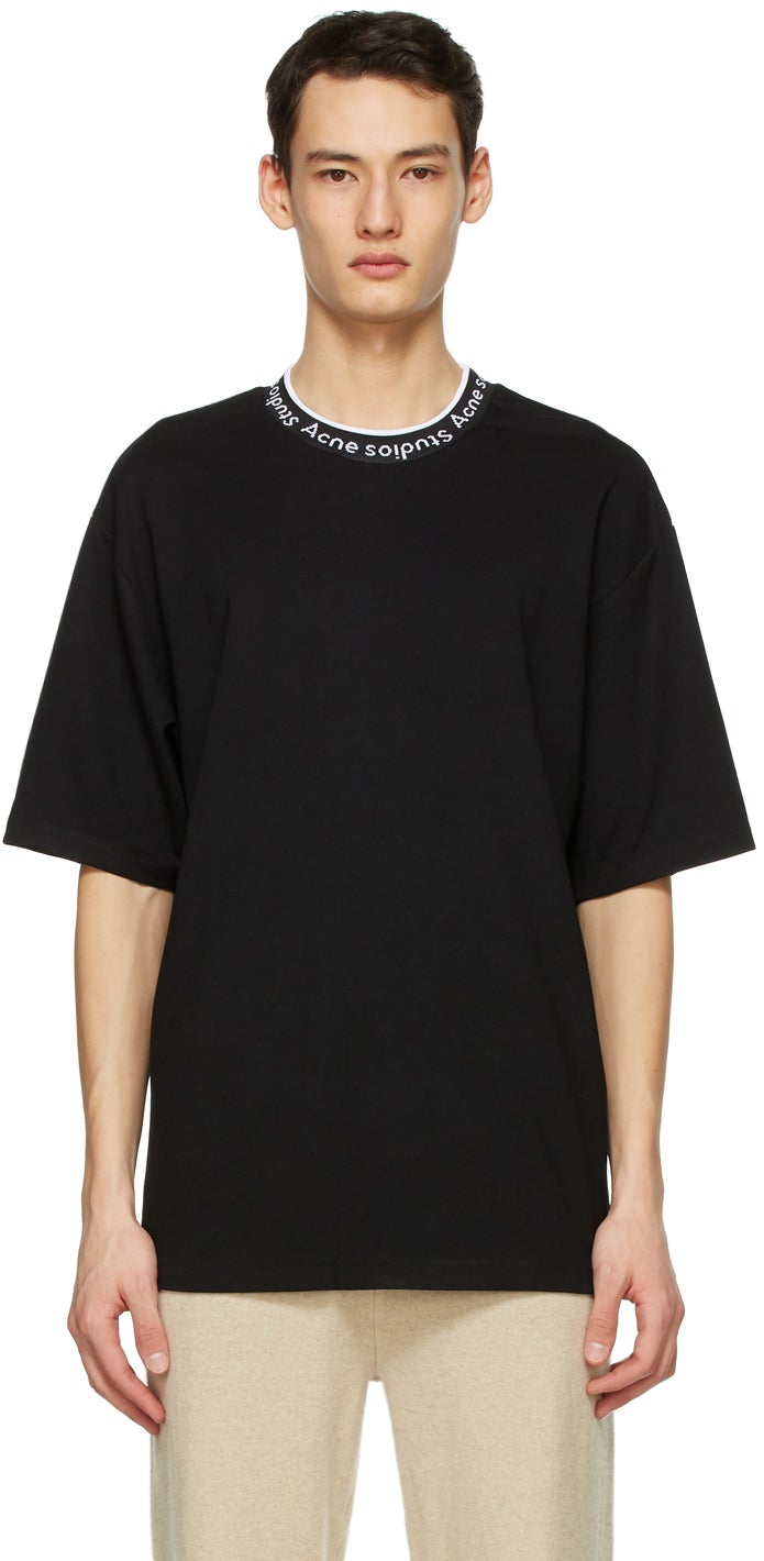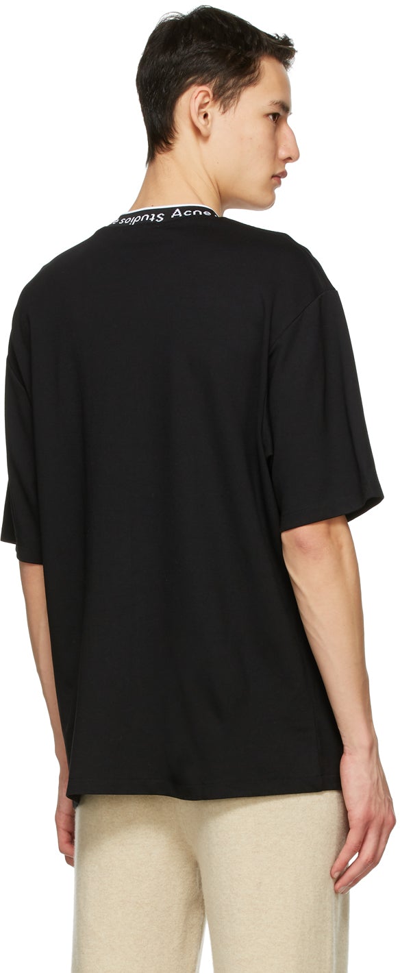 Short sleeve stretch viscose and nylon-blend jersey T-shirt in black. Jacquard knit logo pattern in white at rib knit crewneck collar. Supplier color: Black 67% viscose, 27% nylon, 6% elastane. Brand: Acne Studios