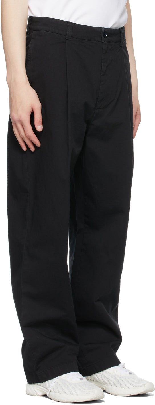 Wide-leg stretch cotton twill trousers in black. Mid-rise. Four-pocket styling. Belt loops at waistband. Pleats at front. Zip-fly. Black and logo-engraved gunmetal-tone hardware. Supplier color: Black Body: 97% cotton, 3% elastane. Trim: 100% cotton. Brand: Acne Studios