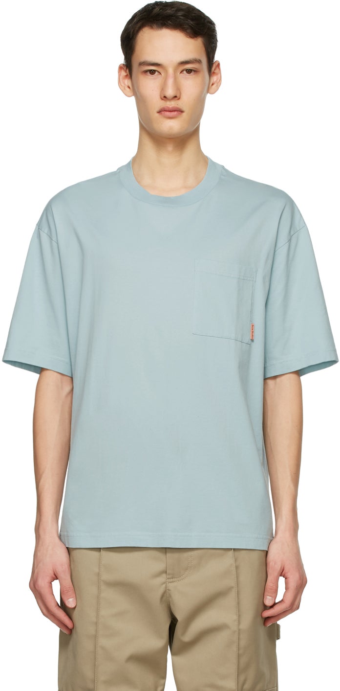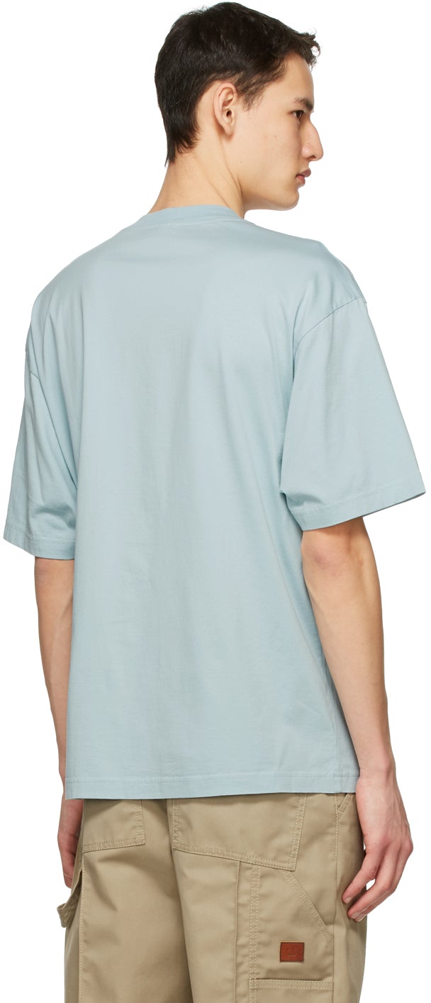 Short sleeve cotton jersey T-shirt in blue. Rib knit crewneck collar. Patch pocket and textile logo flag in pink and black at chest. Supplier color: Sea foam green 100% cotton. Brand: Acne Studios
