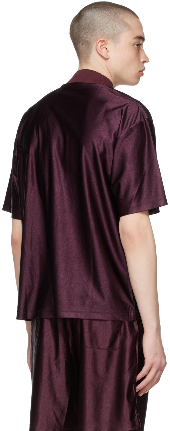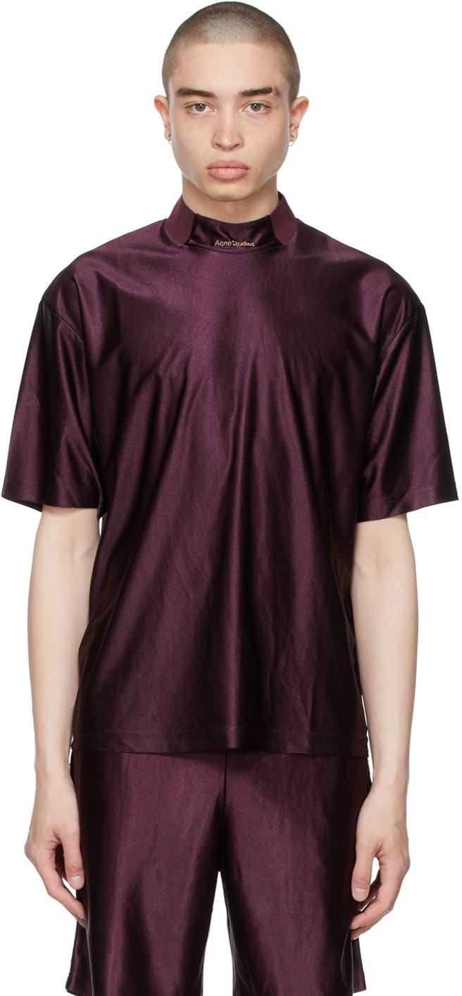 Short sleeve technical twill T-shirt in burgundy. Piping in black throughout. Logo embroidered in gold-tone at mock neck collar. Rib knit trim at back collar. Supplier color: Maroon red 100% polyester. Brand: Acne Studios