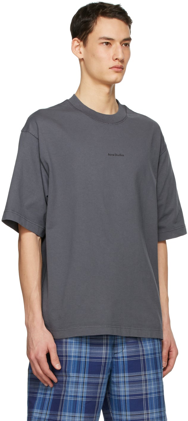 Short sleeve cotton jersey T-shirt in grey. Rib knit crewneck collar. Logo printed in black at chest. Supplier color: Slate grey 100% cotton. Brand: Acne Studios