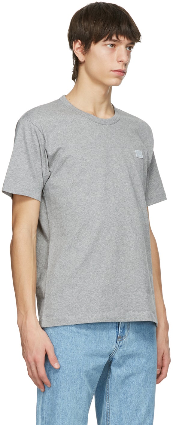 Short sleeve organic cotton jersey t-shirt in grey. Rib knit crewneck collar. Tonal embroidered graphic appliqué at chest. Supplier color: Light grey 100% organic cotton. Brand: Acne Studios