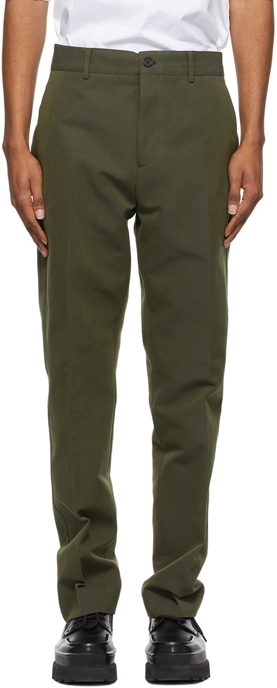Straight-leg cotton-blend twill trousers in khaki. Mid-rise. Four-pocket styling. Belt loops at waistband. Central pinched seams at front and back. Zip-fly. Black and silver-tone hardware. Supplier color: Hunter green 57% cotton, 43% polyester. Brand: Acne Studios