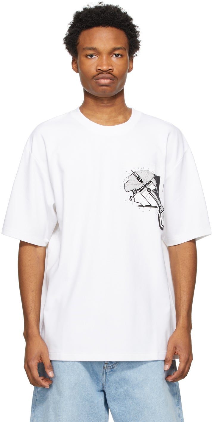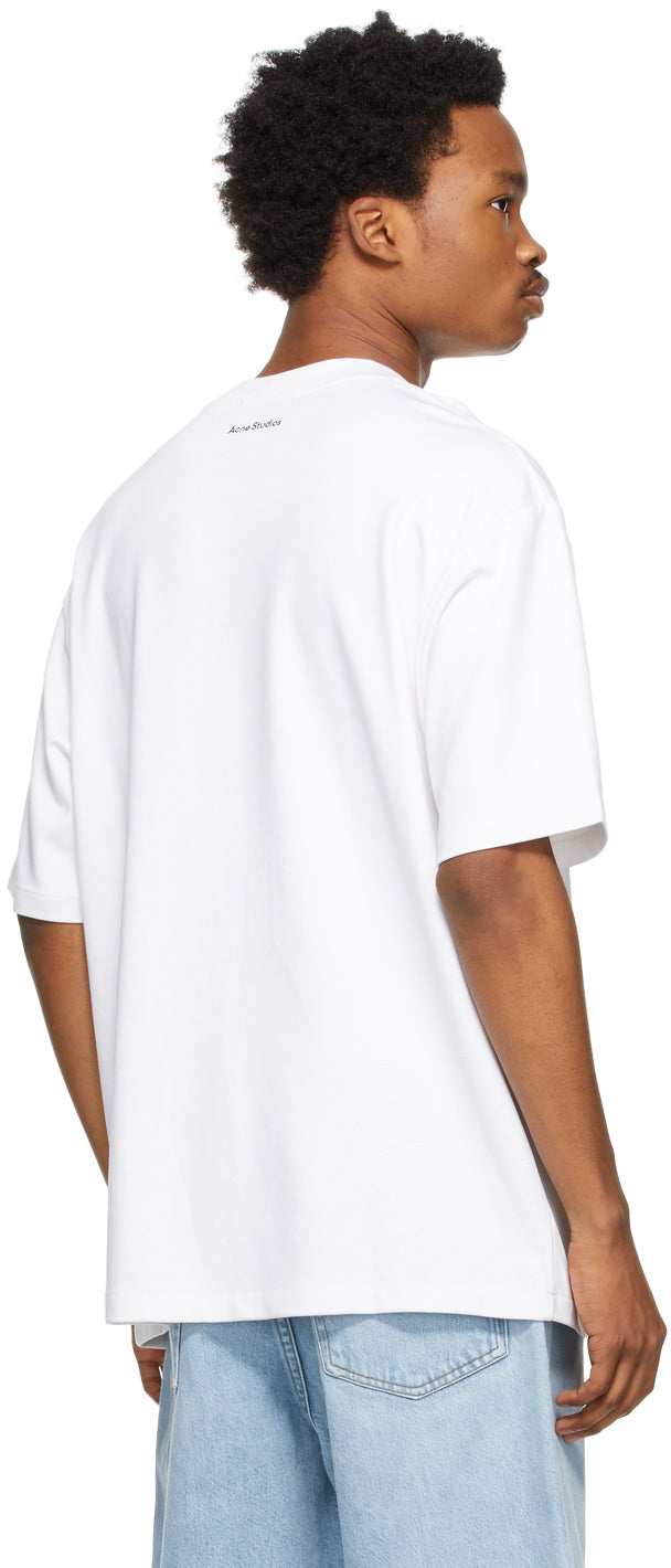 Short sleeve stretch jersey T-shirt in white. Rib knit crewneck collar. Graphic printed and flocked in black and grey at front. Logo printed in black at back collar. Supplier color: Optic white 67% viscose, 27% nylon, 6% elastane. Brand: Acne Studios